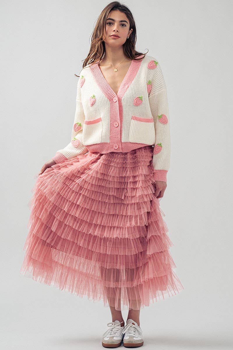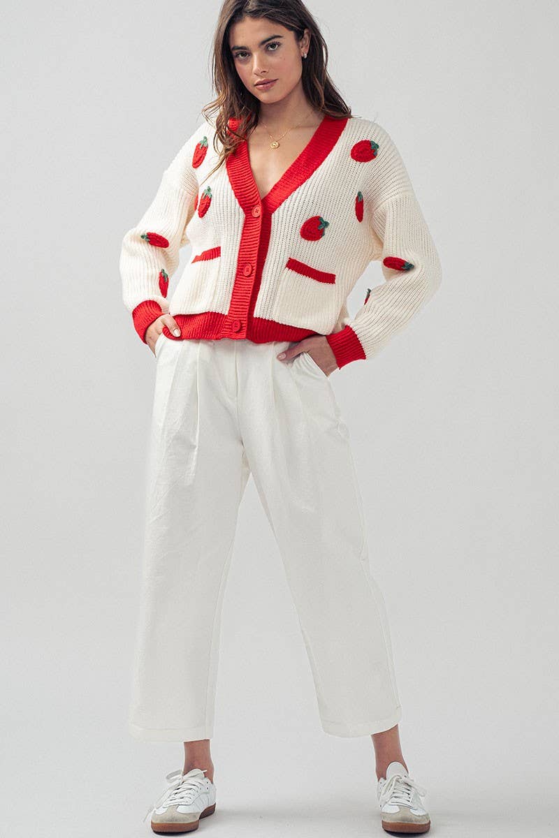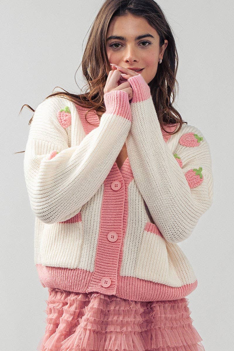Sweet and charming chunky knit cardigan featuring whimsical embroidered strawberries throughout. The deep V-neckline and contrast red trim create a playful silhouette, while front pockets add practical comfort. Perfect for valentine's day or everyday wear.