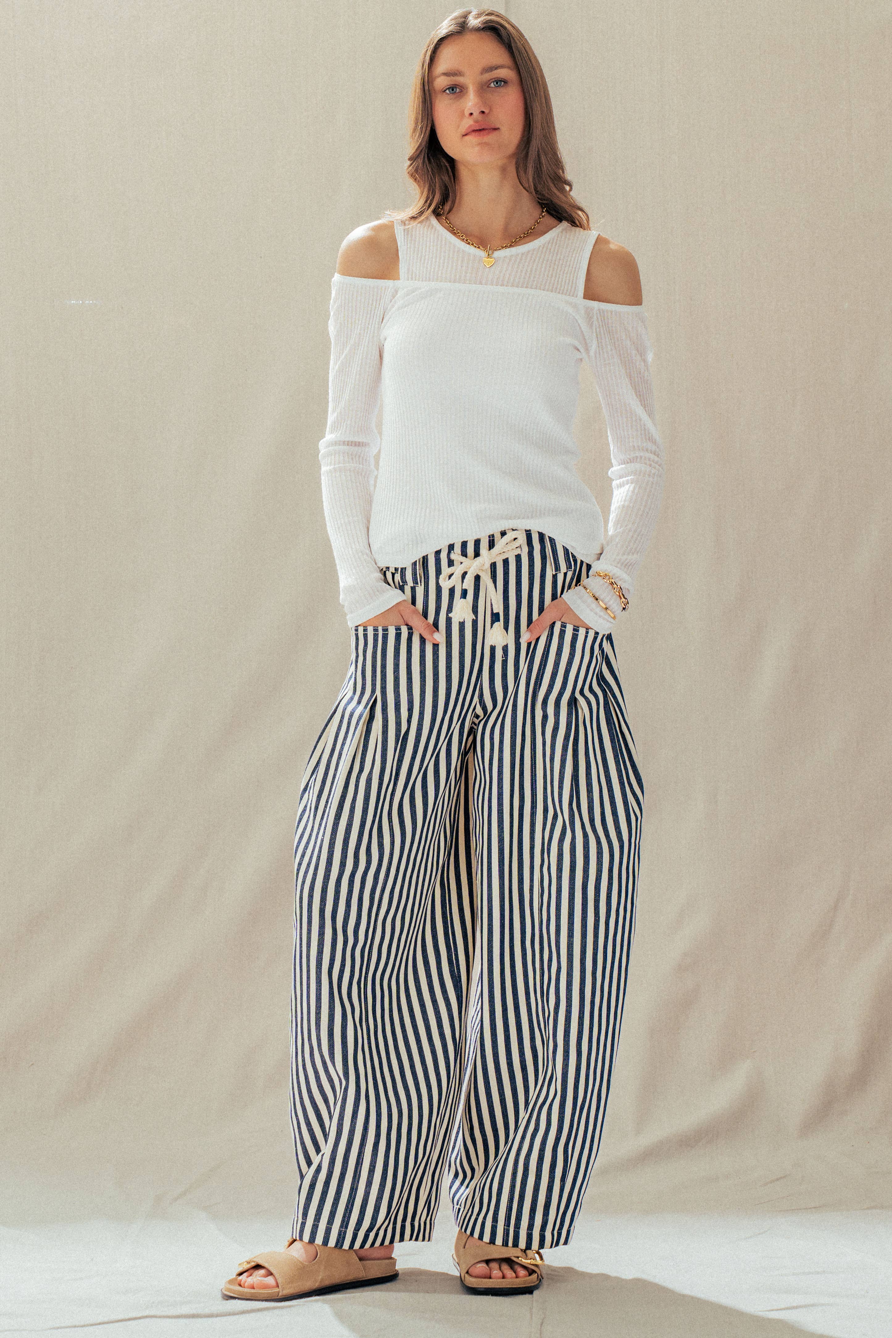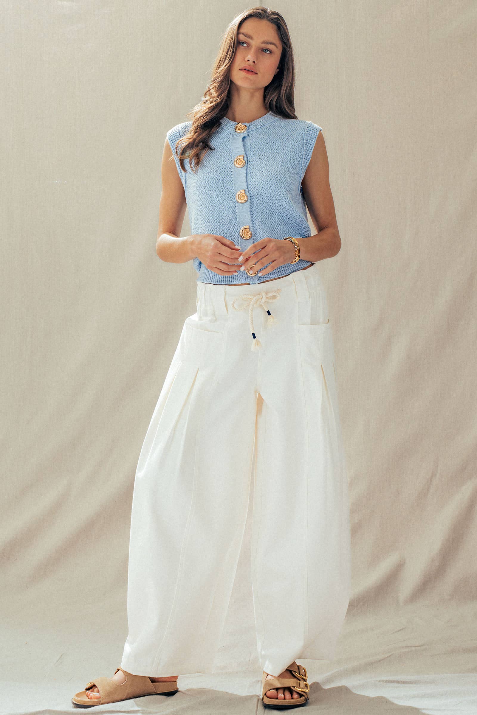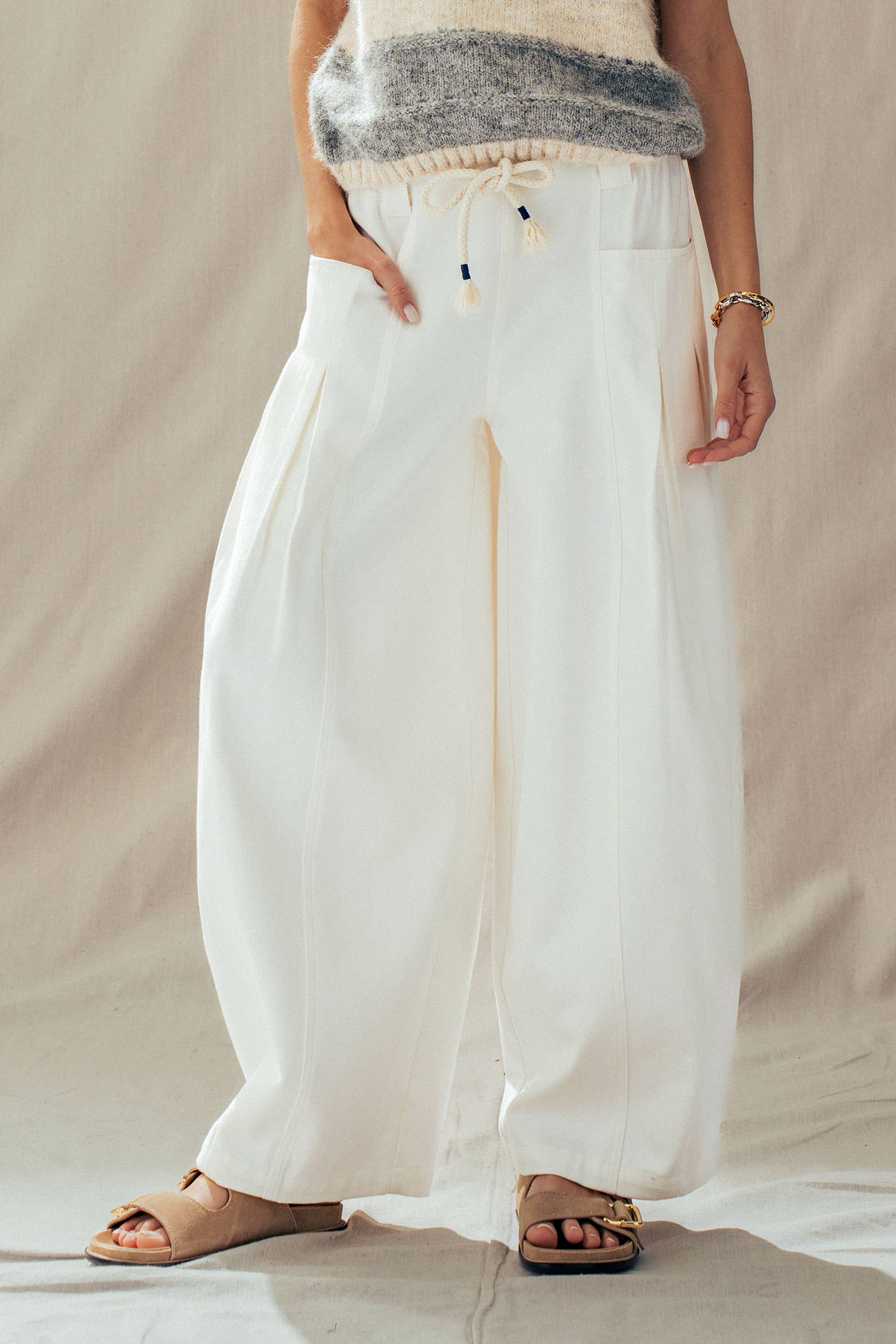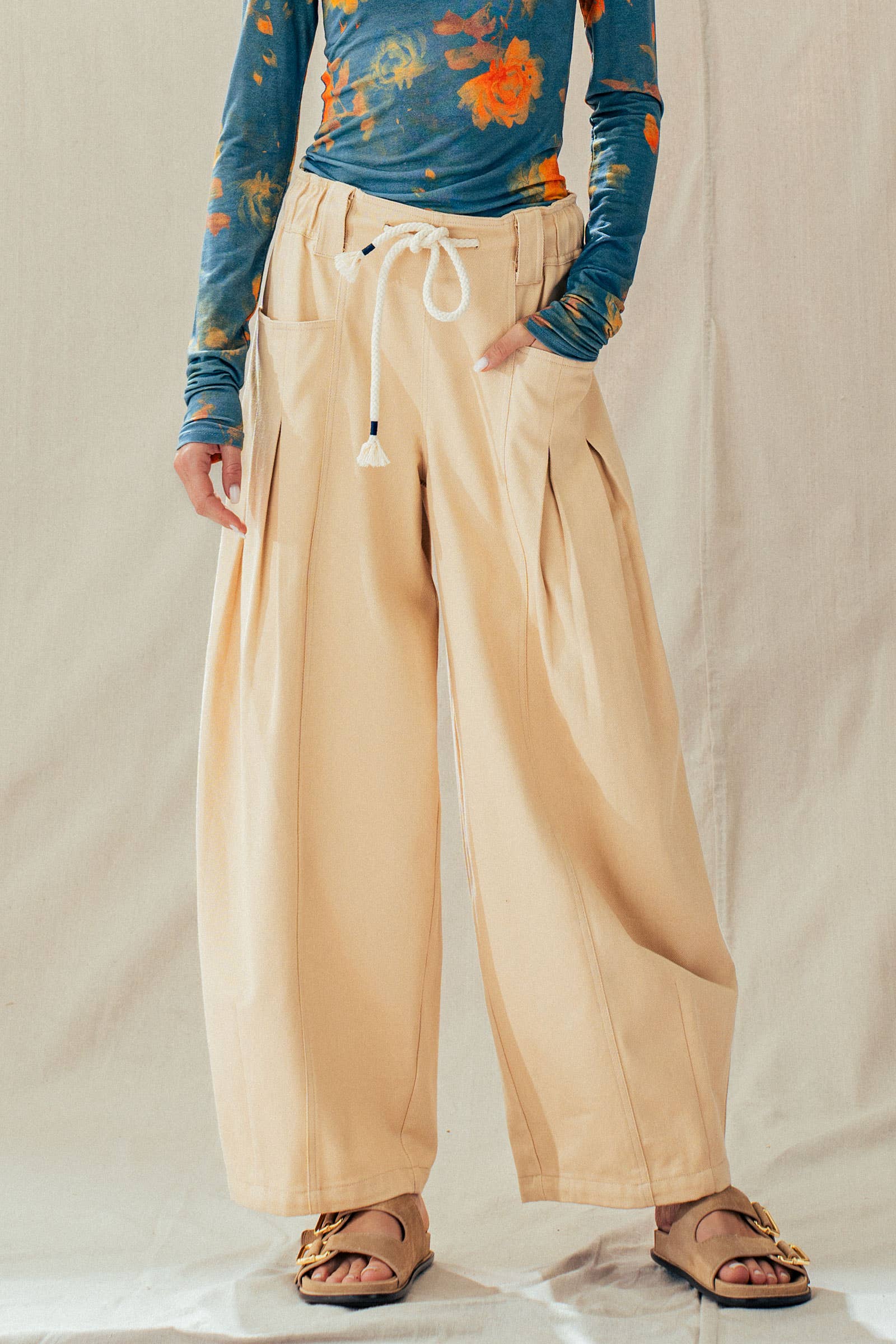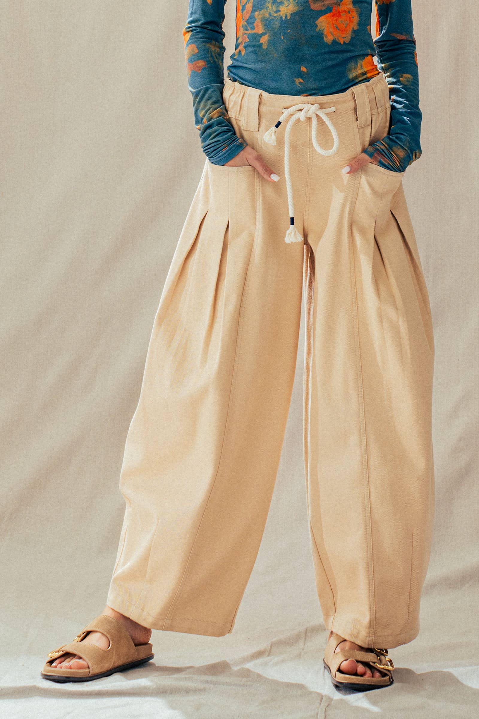 Stay ahead of the curve with these architectural balloon pants. Featuring a dramatic barrel-leg silhouette created by deep front pleats, these trousers offer a modern, relaxed fit that is effortlessly cool. Finished with a nautical rope drawstring for a touch of coastal flair.