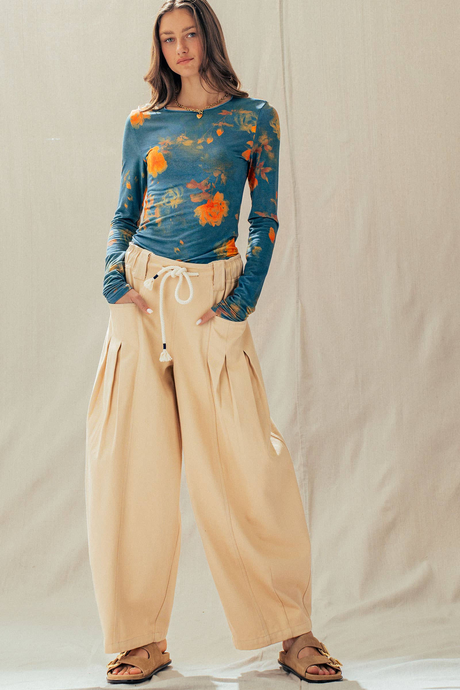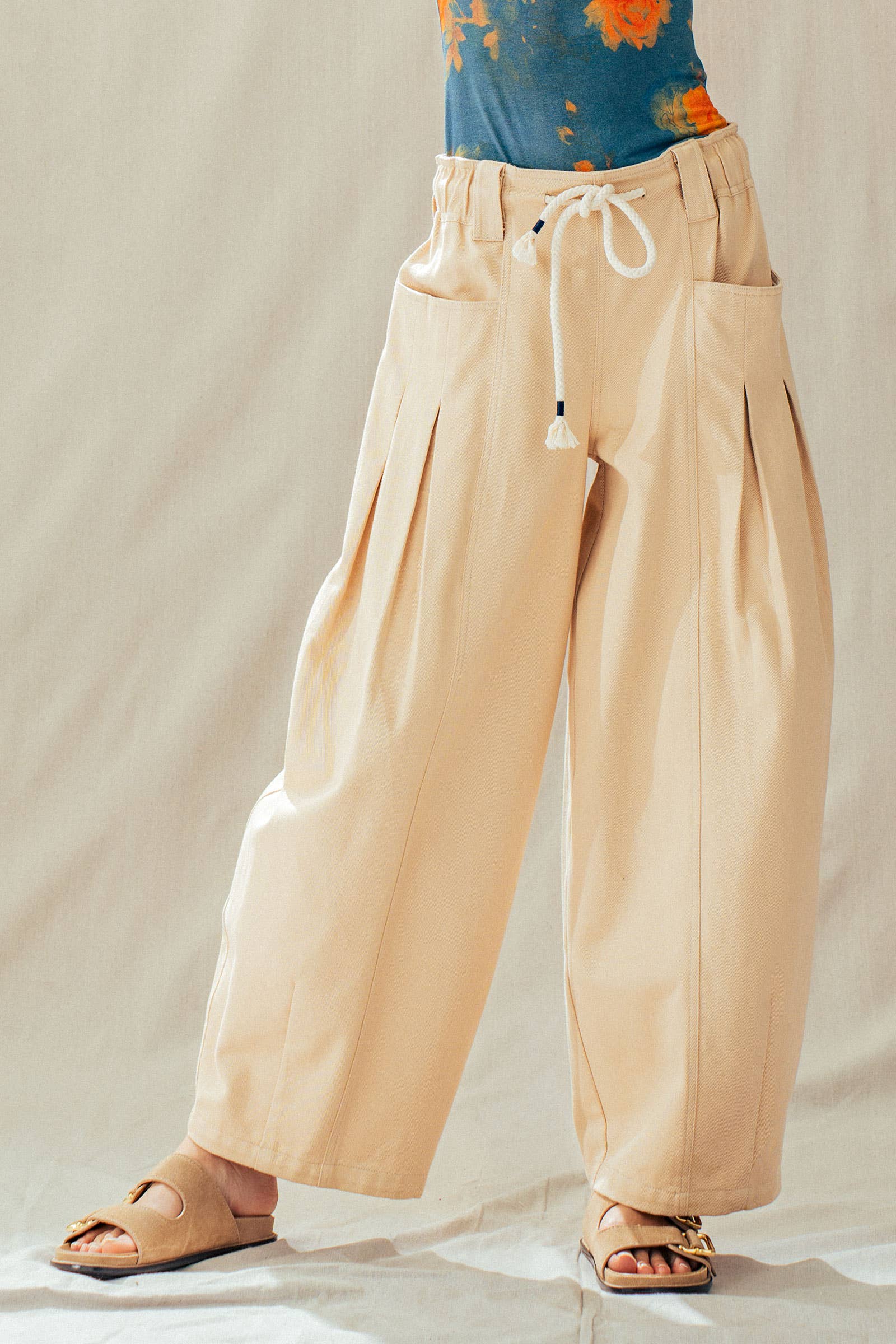 Design & Silhouette: Defined by a high-waisted fit with a comfortable elastic waistband and a statement thick rope drawstring with tasseled ends. The legs feature deep front tucks/pleats that create volume through the thigh before tapering slightly at the ankle.