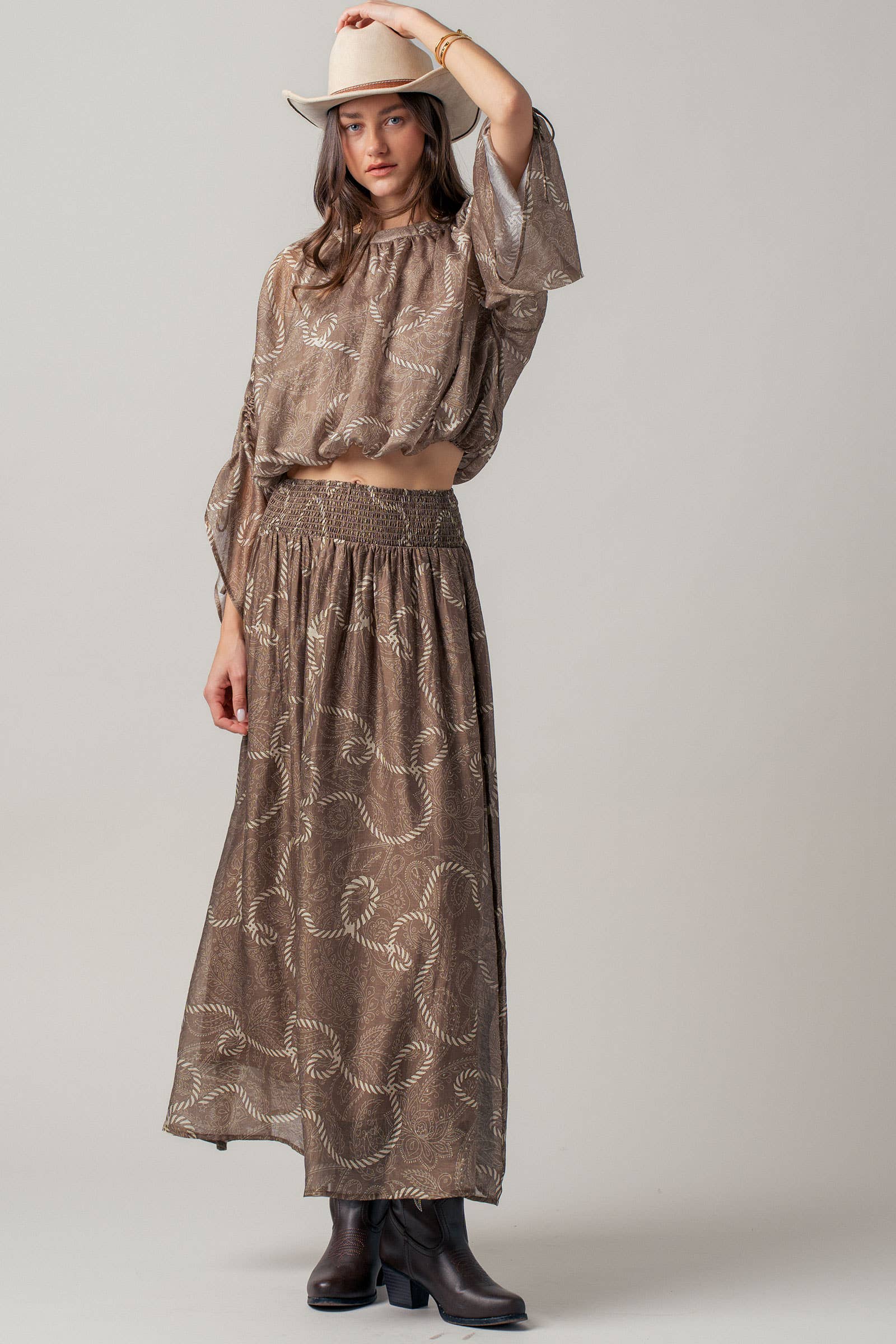 Set sail in style with this luxurious maxi skirt. Featuring an intricate rope and paisley print on a premium linen-silk blend, this skirt offers fluid movement and effortless elegance.