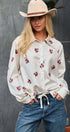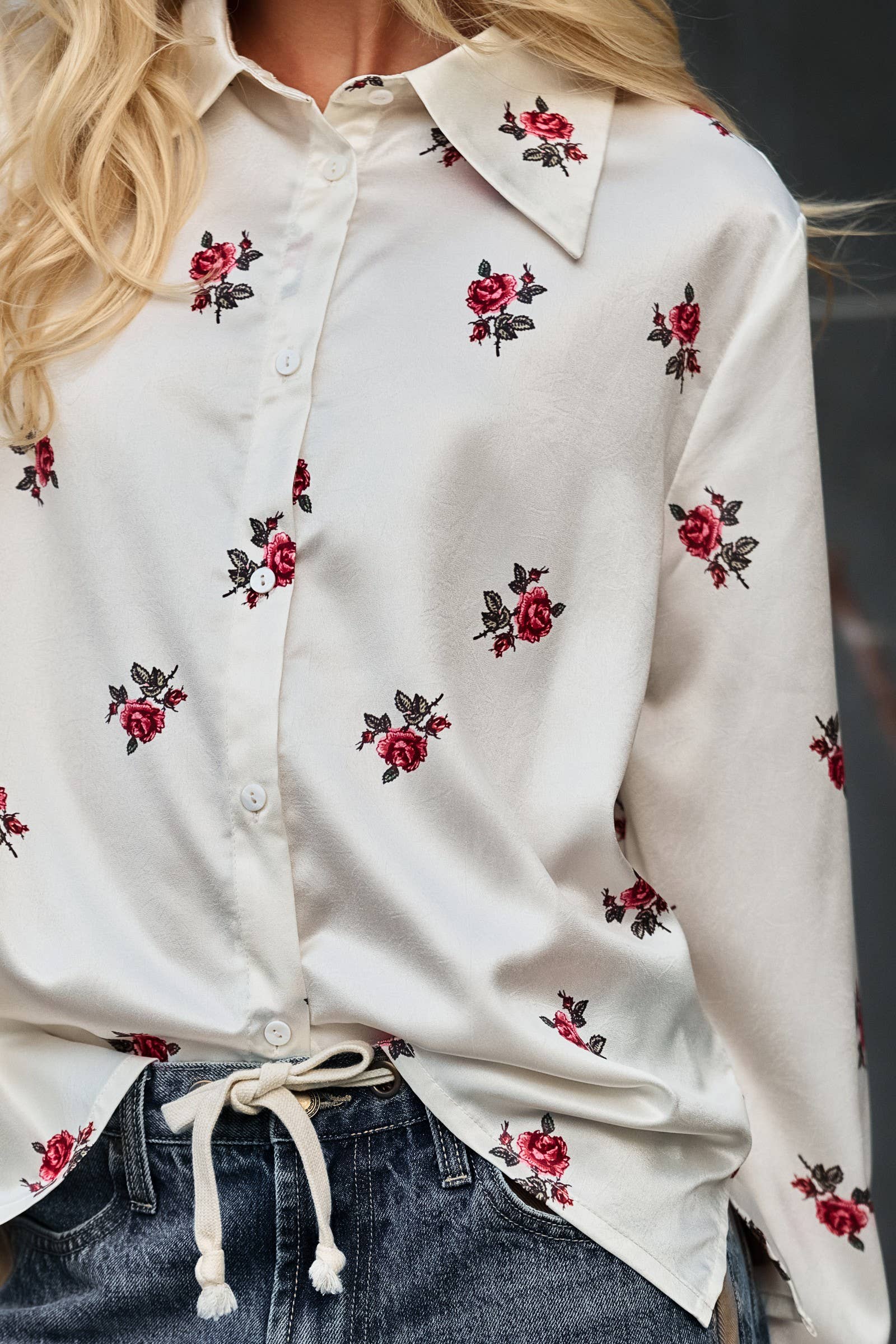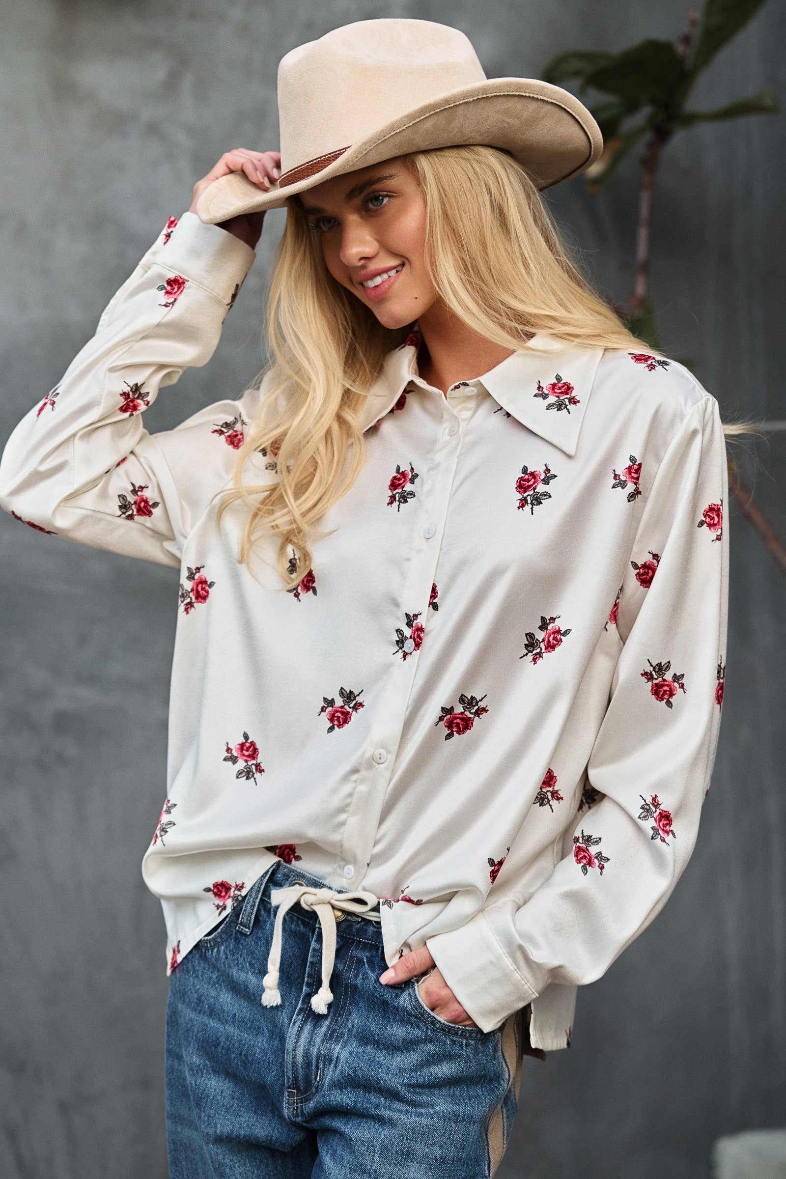 Add a romantic western touch to your wardrobe with this rose print satin blouse. Featuring a classic button-down front and breezy silhouette, it's the perfect lightweight layer for pairing with jeans or throwing over a tank dress on summer days.
