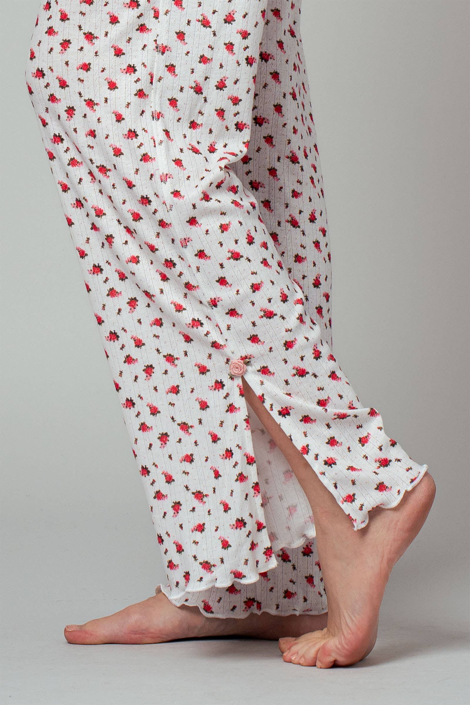 Romantic and relaxed, these rose print lounge pants bring dreamy vibes to everyday comfort. Designed with a flowy wide-leg silhouette and dainty side slit, they are perfect for laid-back mornings or soft set pairings. Finished with a golden button accent, they feel just as special as they look.