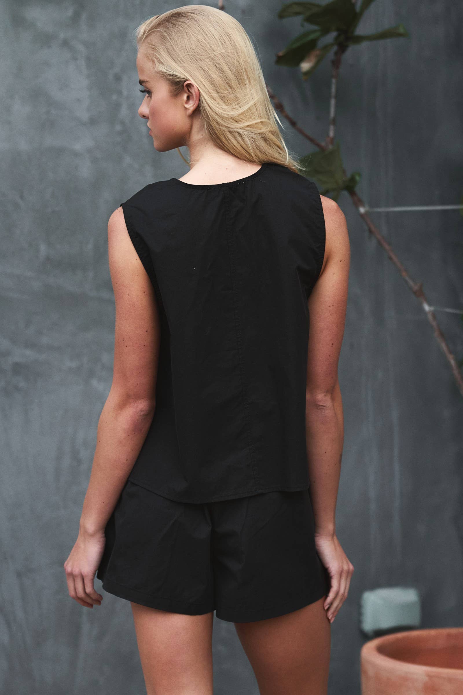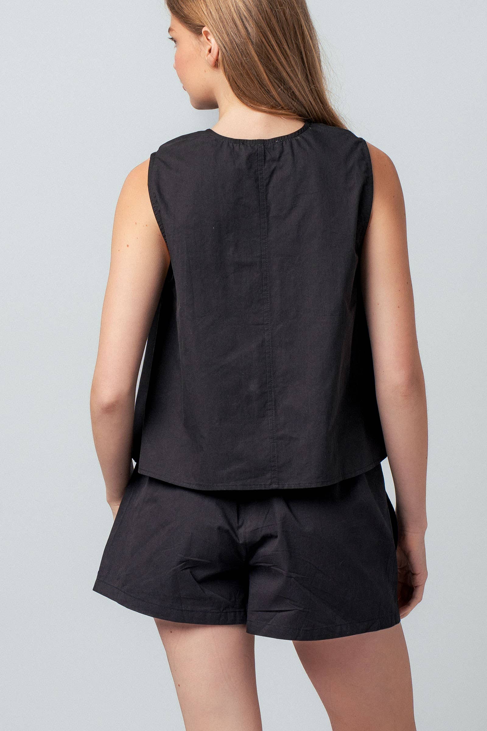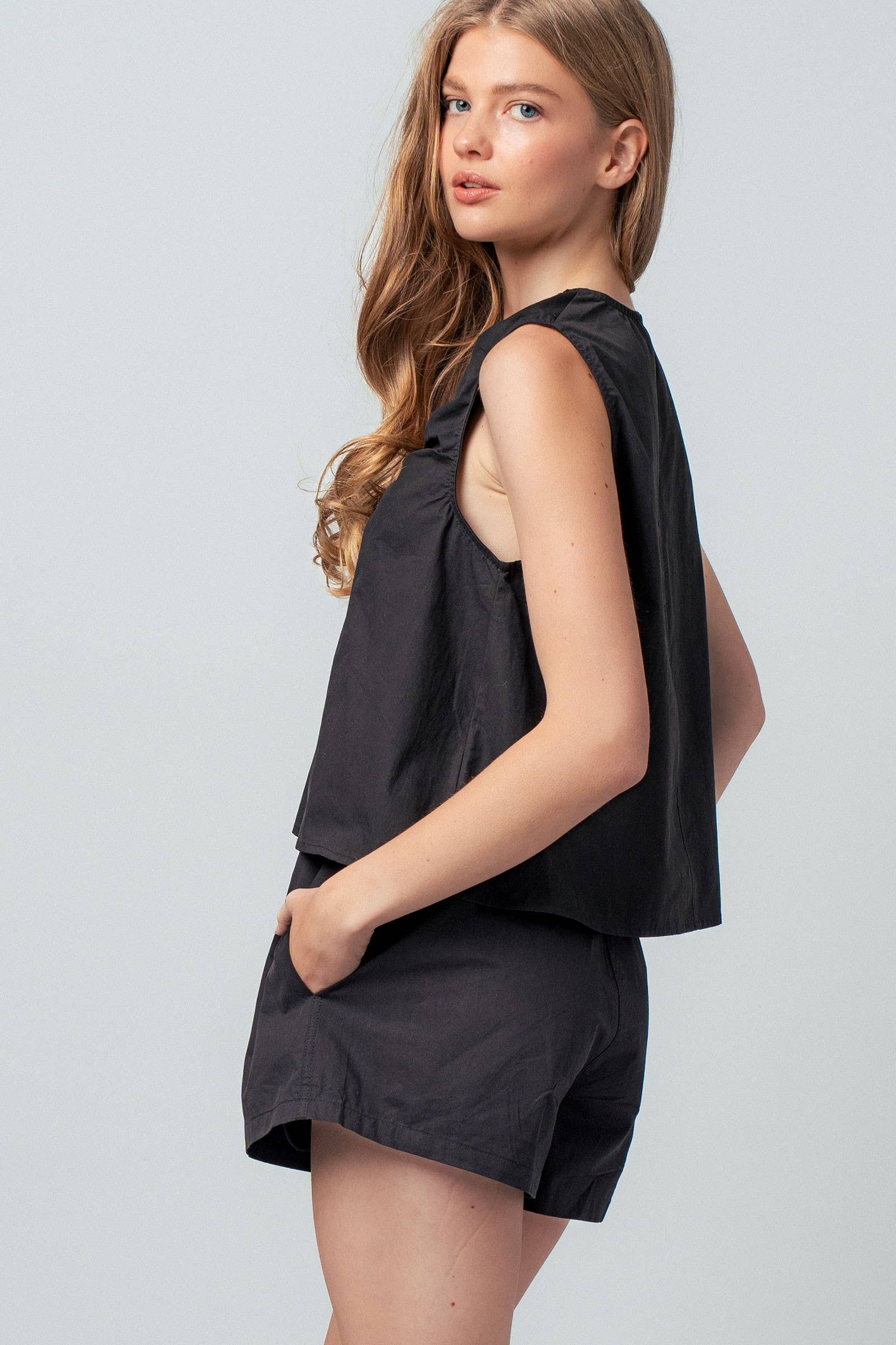 Effortlessly chic, this black cotton matching set is a versatile wardrobe essential. The sleeveless top features a charming gathered scoop neckline for a touch of texture, while the matching shorts ensure breathable comfort for everyday wear.