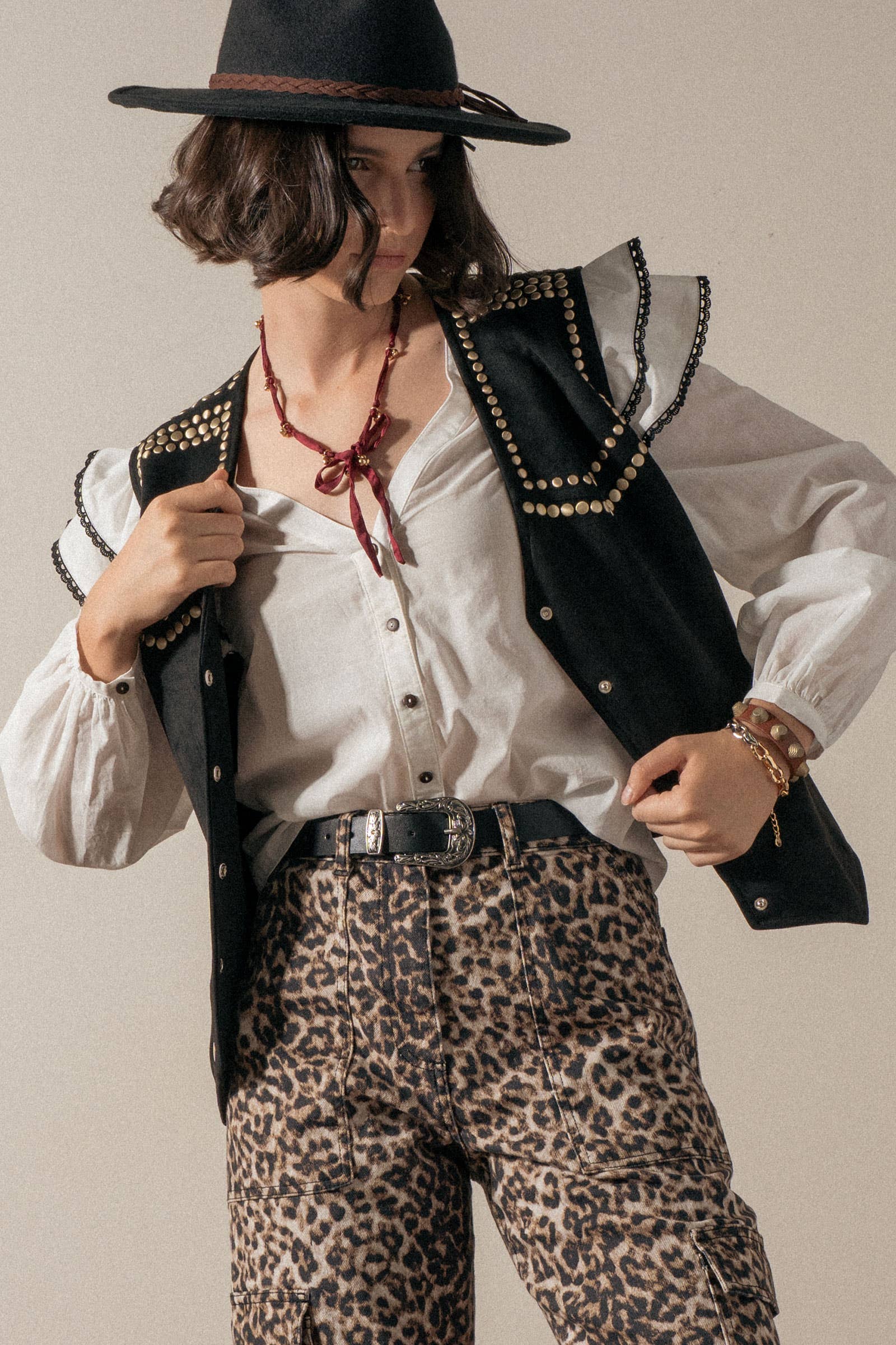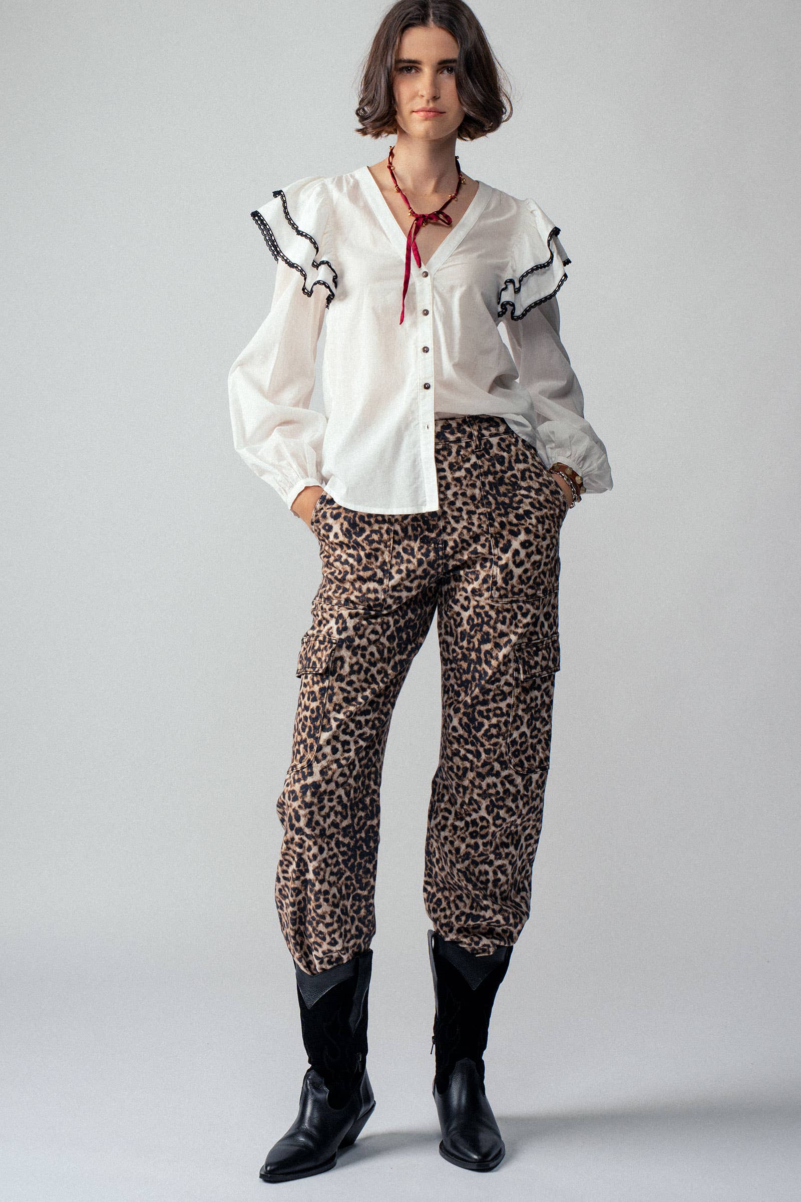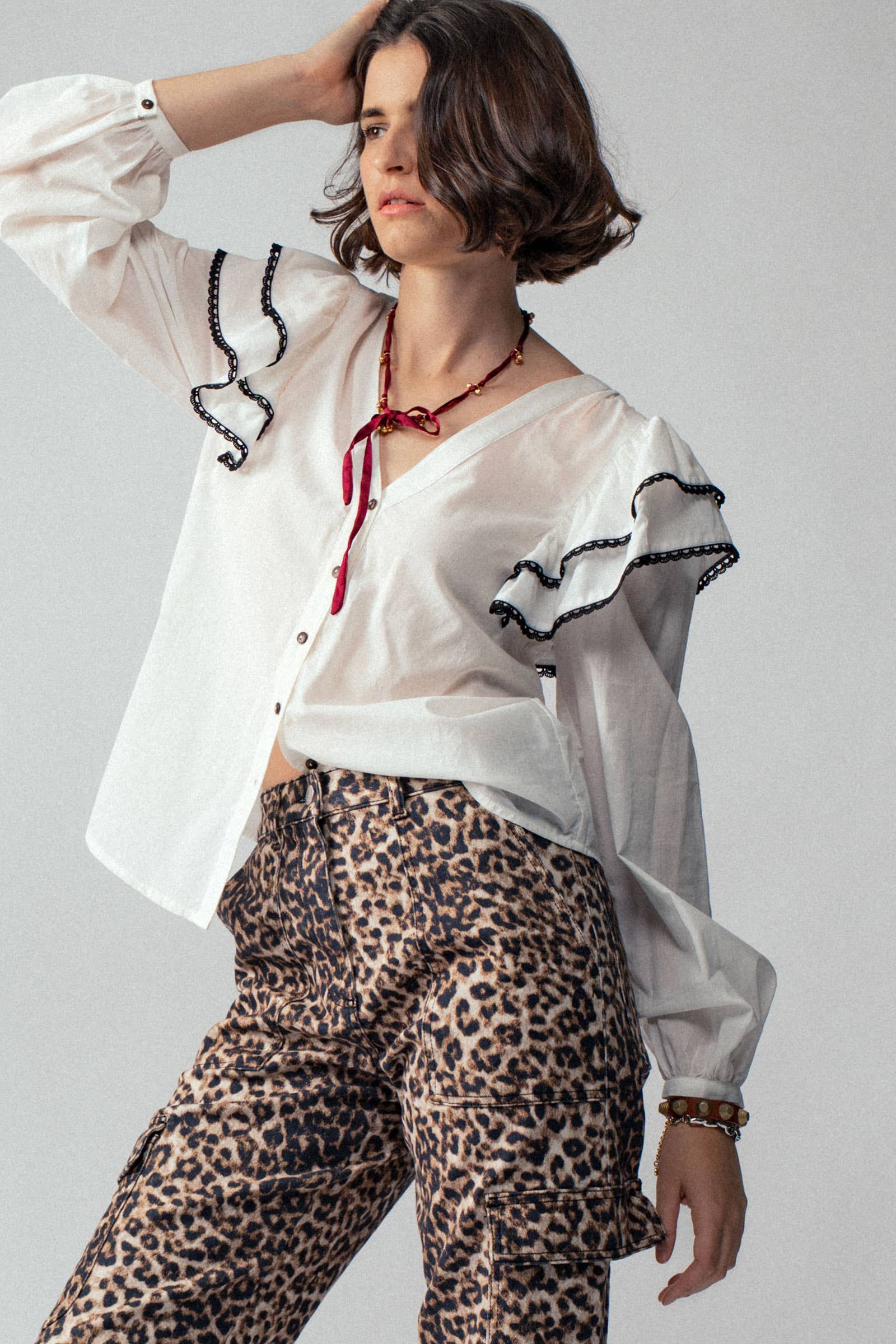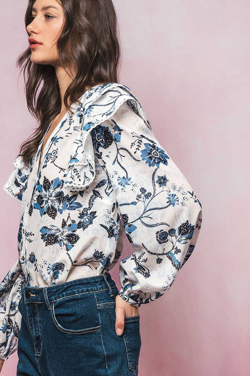 This statement blouse features dramatic ruffled shoulder caps with contrast trim, a flattering V neckline, and a classic button-down front. Balloon sleeves and lightweight fabric create a feminine silhouette perfect for pairing with jeans or summer tops for a chic, boho-inspired look.