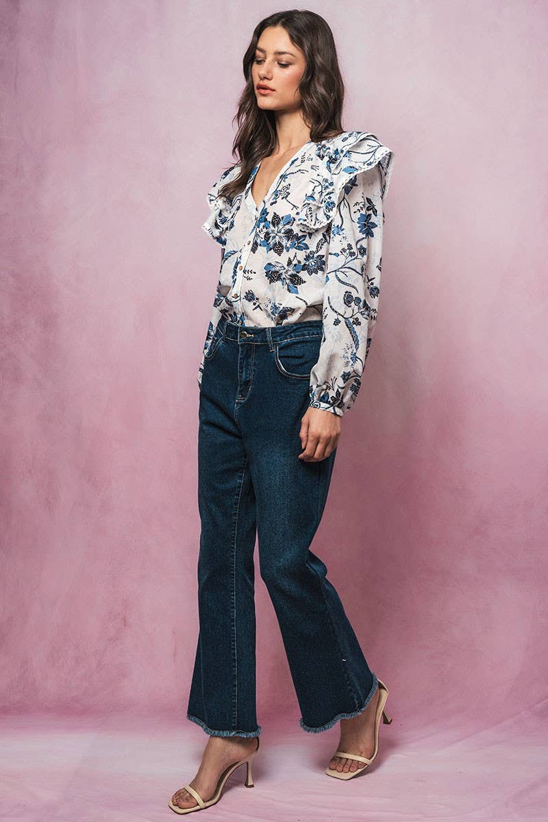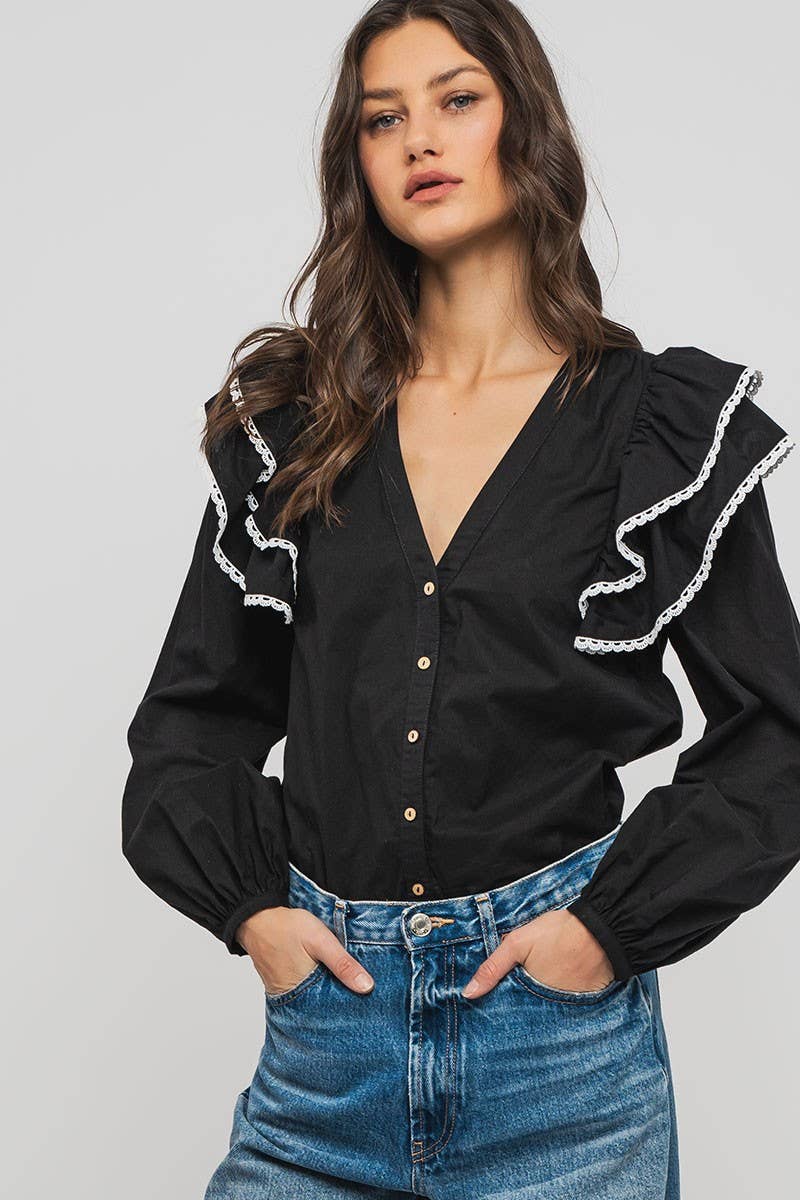 Ruffled Shoulder V Neck Button Down Blouse