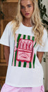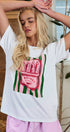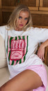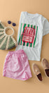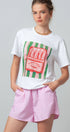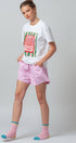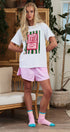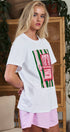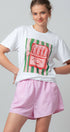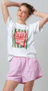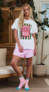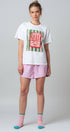 Design: A matching set pairing a white graphic tee with pink and white striped shorts.