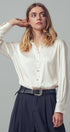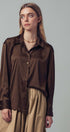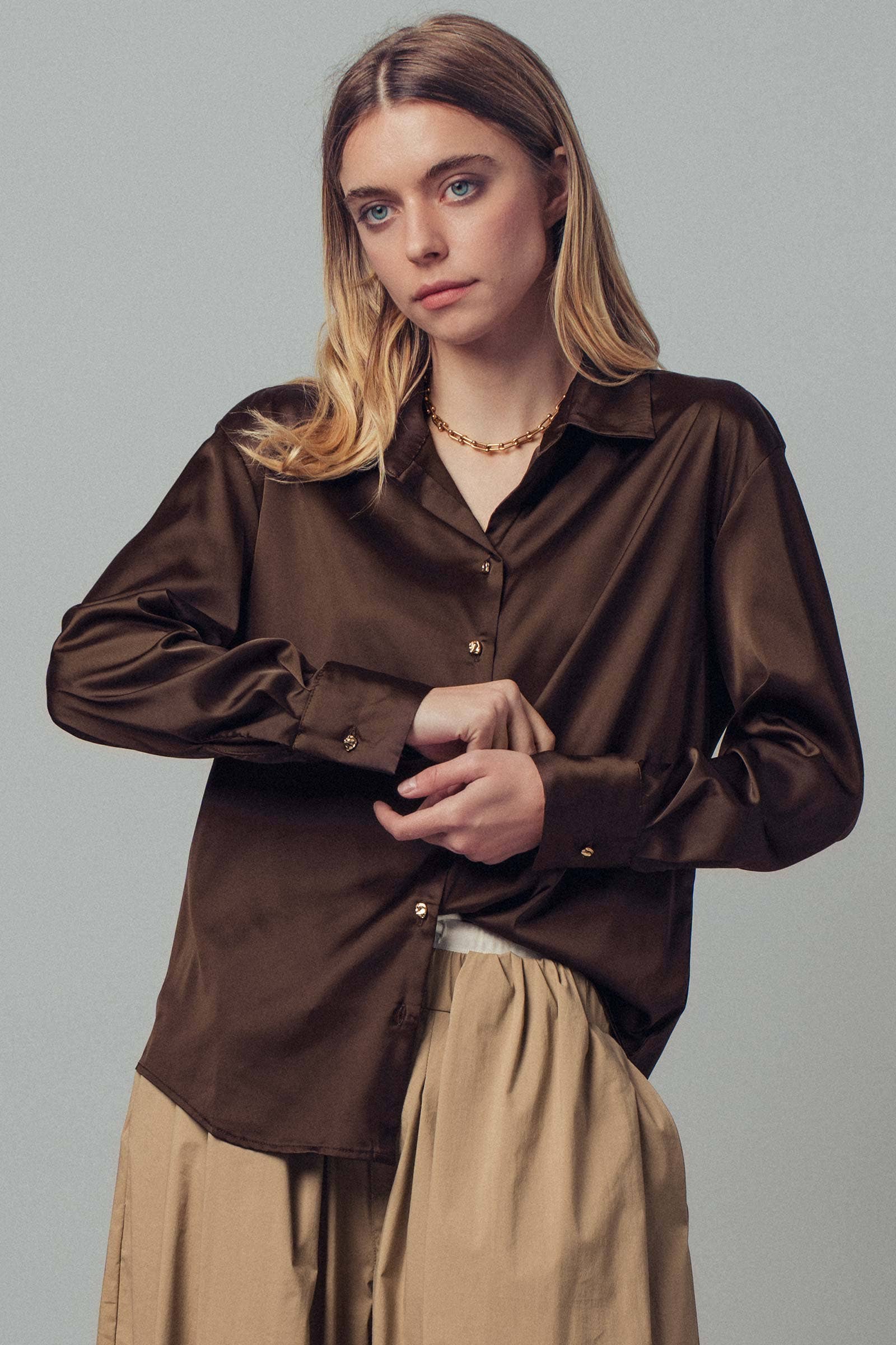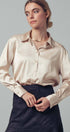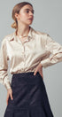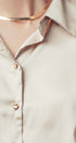 - Details: Satin fabric with subtle sheen, pointed collar, gold-tone button closure, long sleeves with tailored cuffs