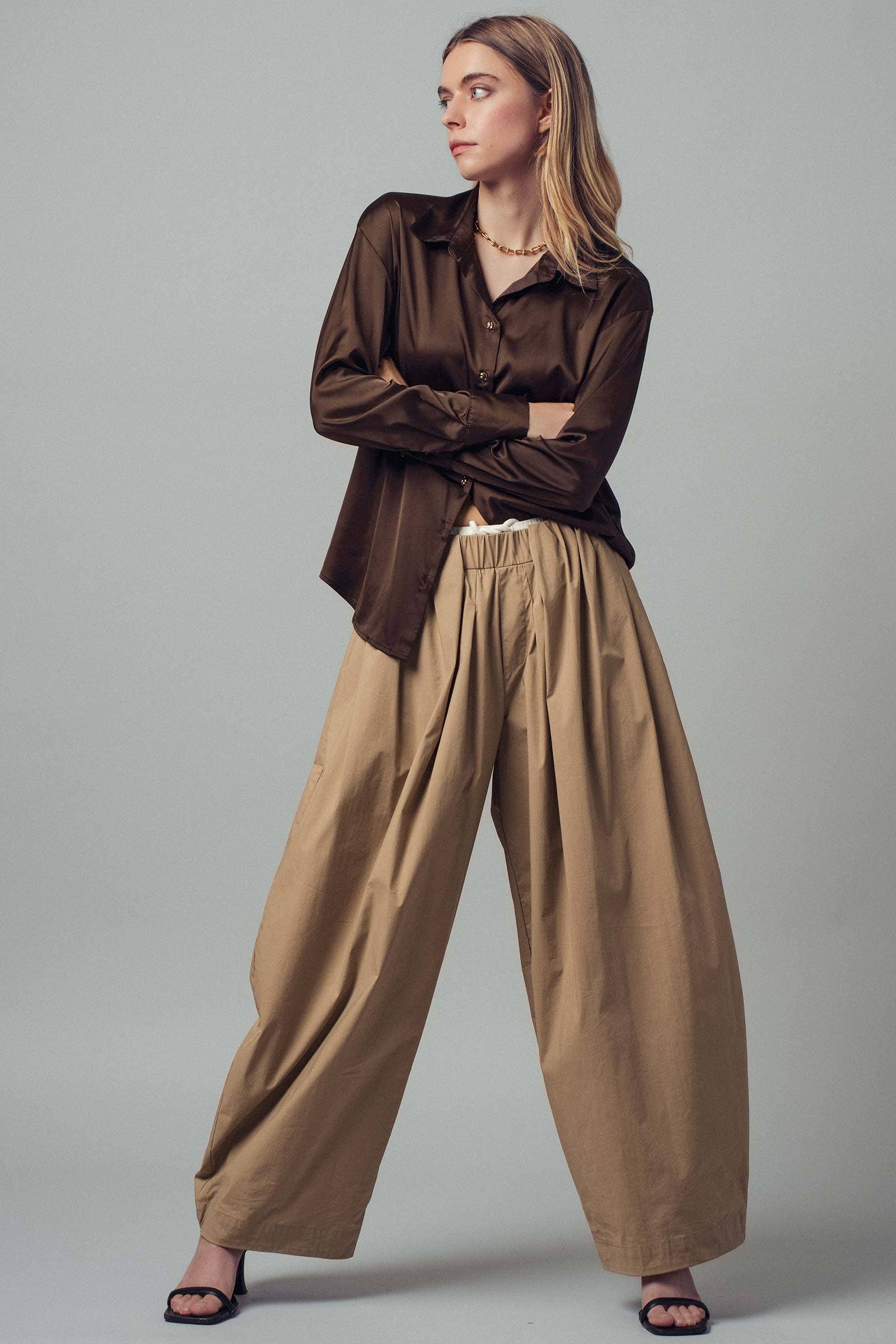 Elevate everyday style with our satin button-down blouse, designed for effortless elegance and versatility. Crafted from silky satin with a subtle sheen, it drapes smoothly over the body for a polished, sophisticated finish. A pointed collar and button-front closure with delicate gold-tone buttons add refined detail, while tailored cuffs balance the blouse’s relaxed silhouette. Soft, lightweight, and breathable, this blouse transitions seamlessly from work to weekend, pairing effortlessly with trousers, skirts, or layered under blazers. A versatile wardrobe essential for retailers seeking timeless, polished tops with broad styling potential.