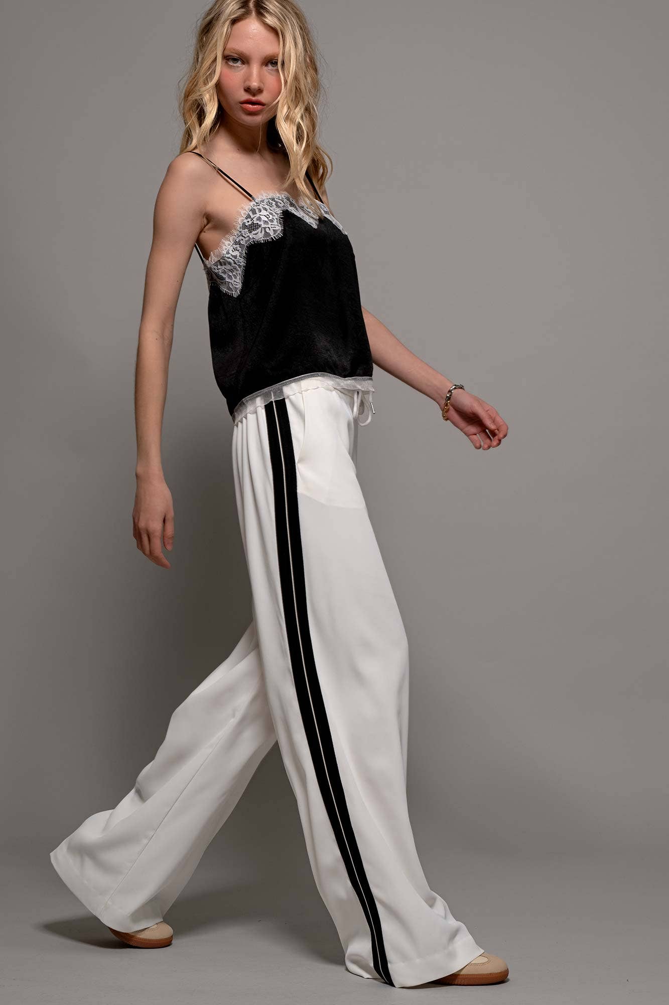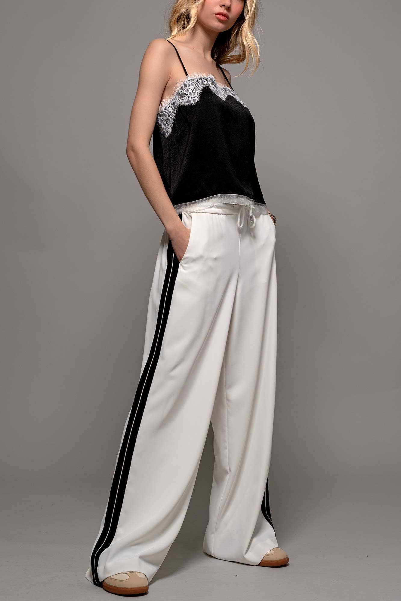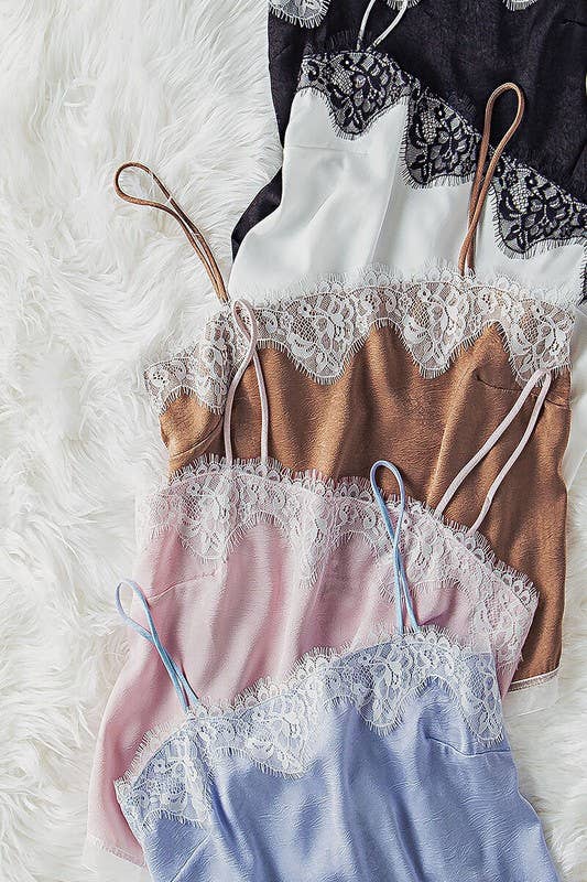 A luxurious satin camisole featuring delicate lace trim detailing along the neckline. The adjustable spaghetti straps and relaxed fit create an elegant silhouette perfect for both layering and wearing alone.
