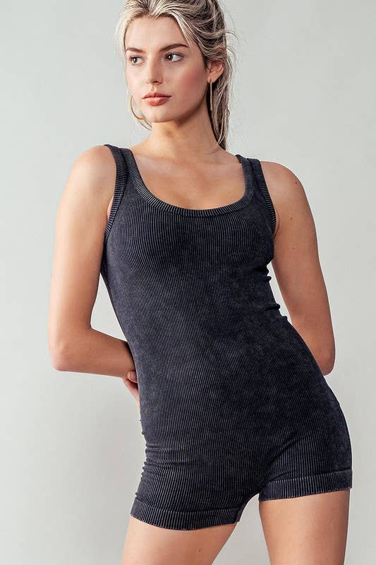 This stylish seamless ribbed romper features a flattering sleeveless design and a mineral-washed finish, perfect for spring and summer wear. Its soft, stretchy fabric ensures comfort and ease of movement.