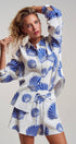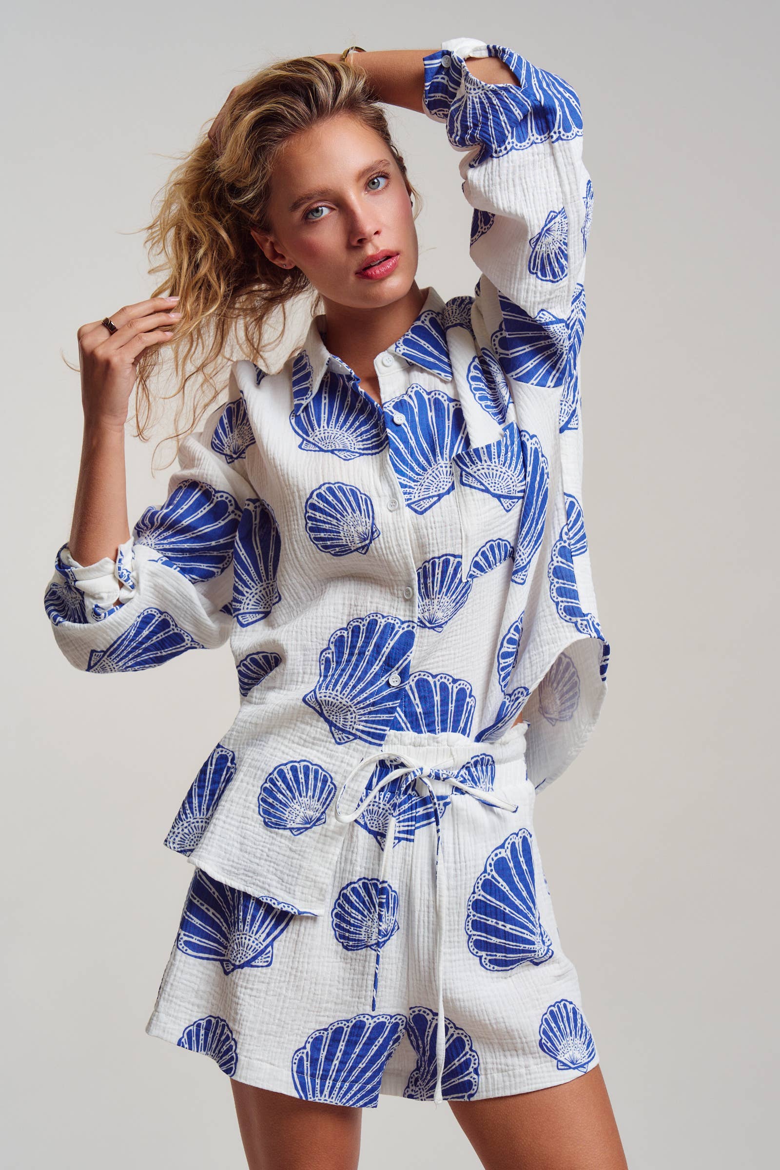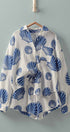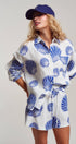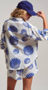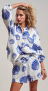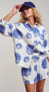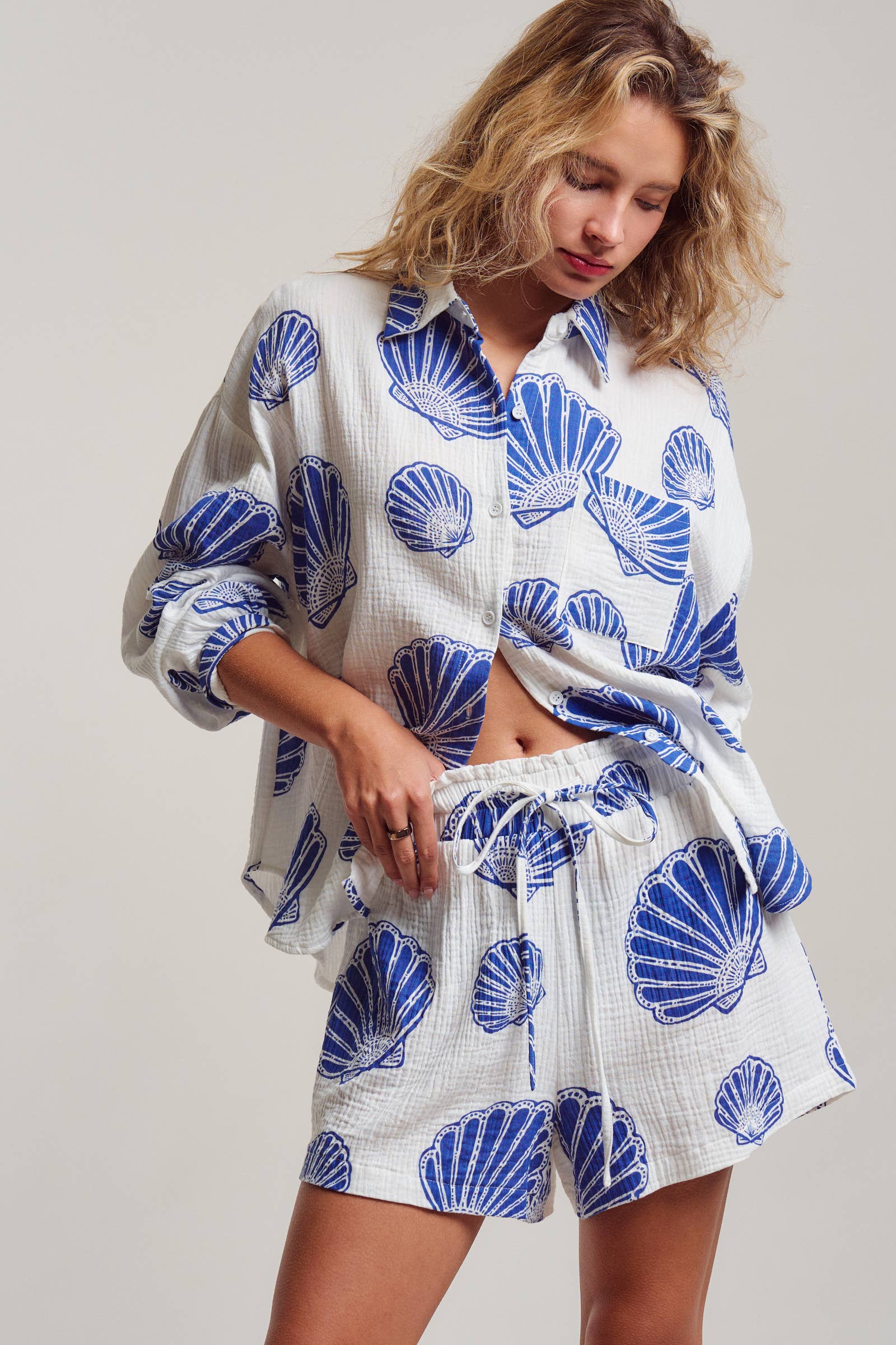 mbrace seaside luxury with this effortless two-piece matching set. Crafted from breathable 100% cotton with a soft, crinkled gauze texture, this lounge-ready outfit features a bold blue scallop shell print that transitions perfectly from beach cover-up to summer sleepwear.