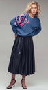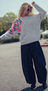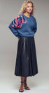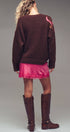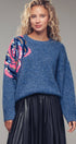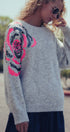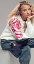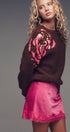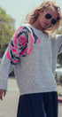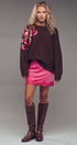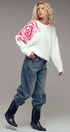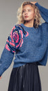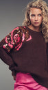Plush fuzzy knit sweater featuring a bold oversized floral motif in pink and gold sequins. Designed with a relaxed silhouette, dropped shoulders, and ribbed trims for comfort and shine.