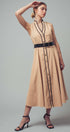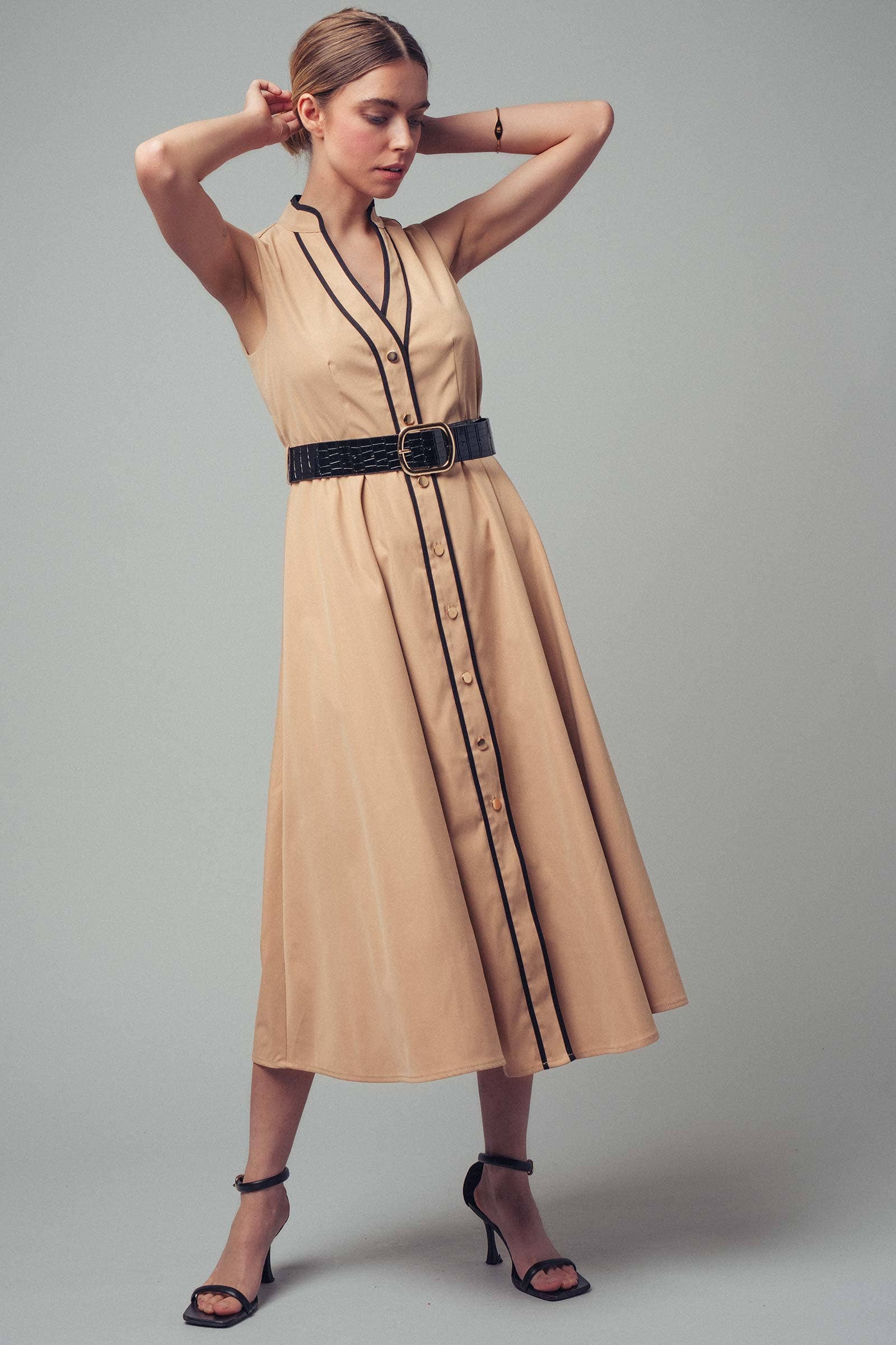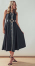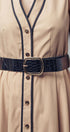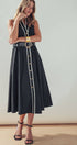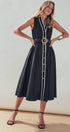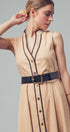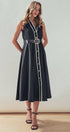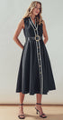A sophisticated and polished choice with a touch of vintage charm, this A-line midi dress is effortlessly elegant. Crafted from a structured cotton blend, its defining feature is the sharp, black contrast trim that outlines the silhouette. The classic button-front and sleeveless design make it a versatile piece for work or special events.