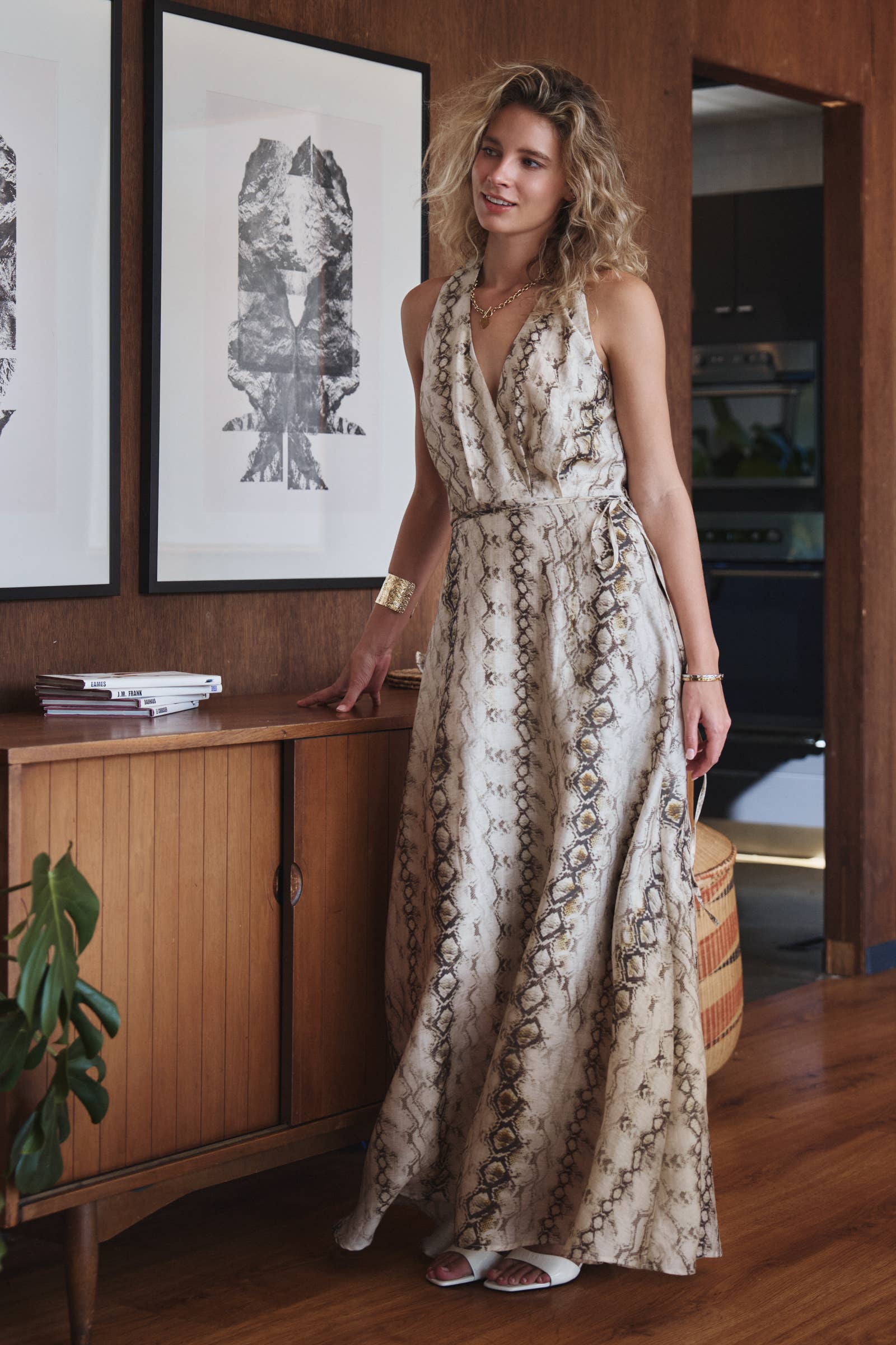Snake Print Tencel Linen Halter Maxi Dress