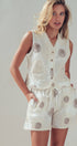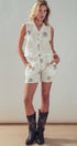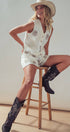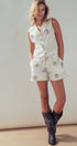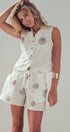This matching two-piece set features a charming button-front vest and shorts, adorned with unique spiral embroidery and playful pom-pom trim. Crafted from a breathable cotton shell, it offers a fresh, bohemian take on western apparel that styles effortlessly with cowboy boots for festivals or sandals for a relaxed summer look.
