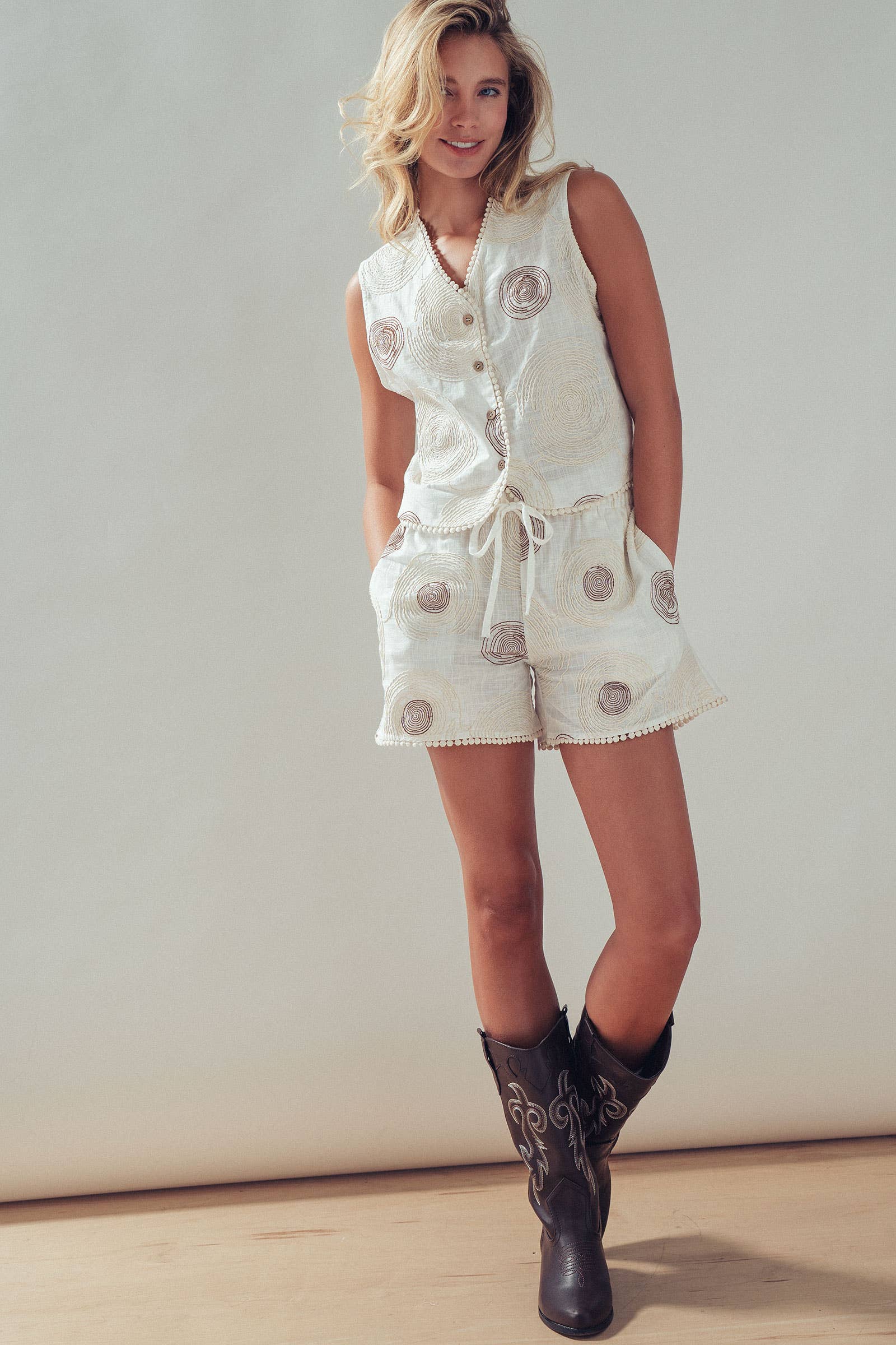 Design: Cream vest and shorts set with brown spiral embroidery, pockets, and pom-pom hem details