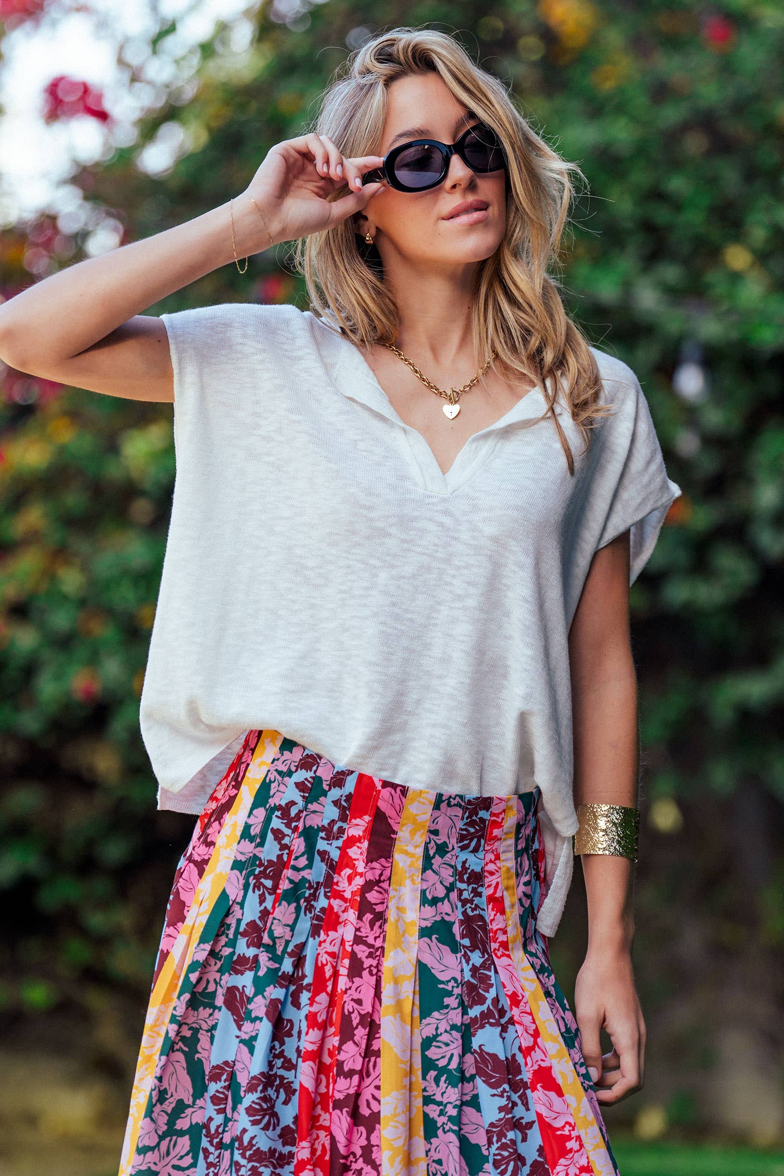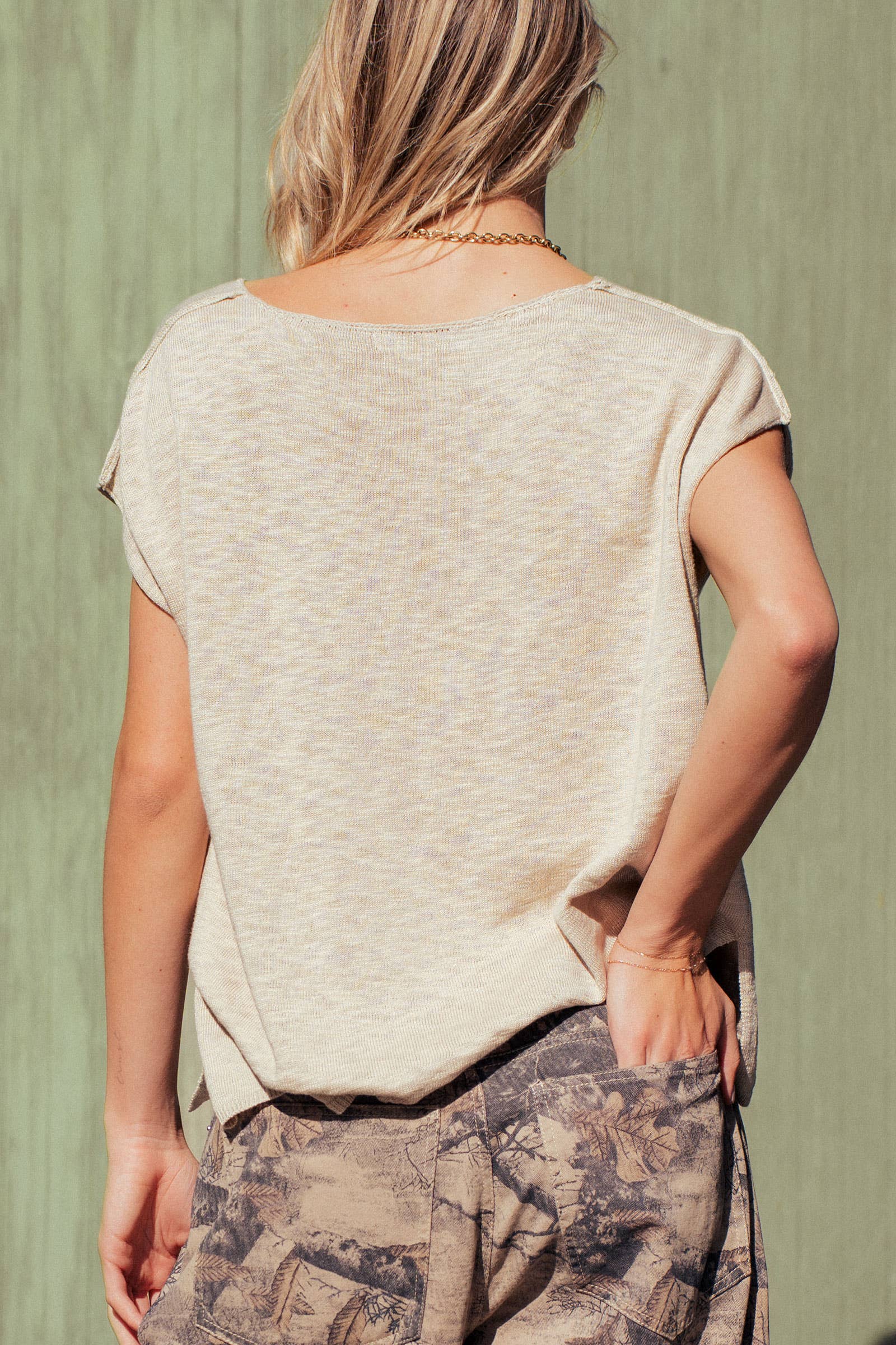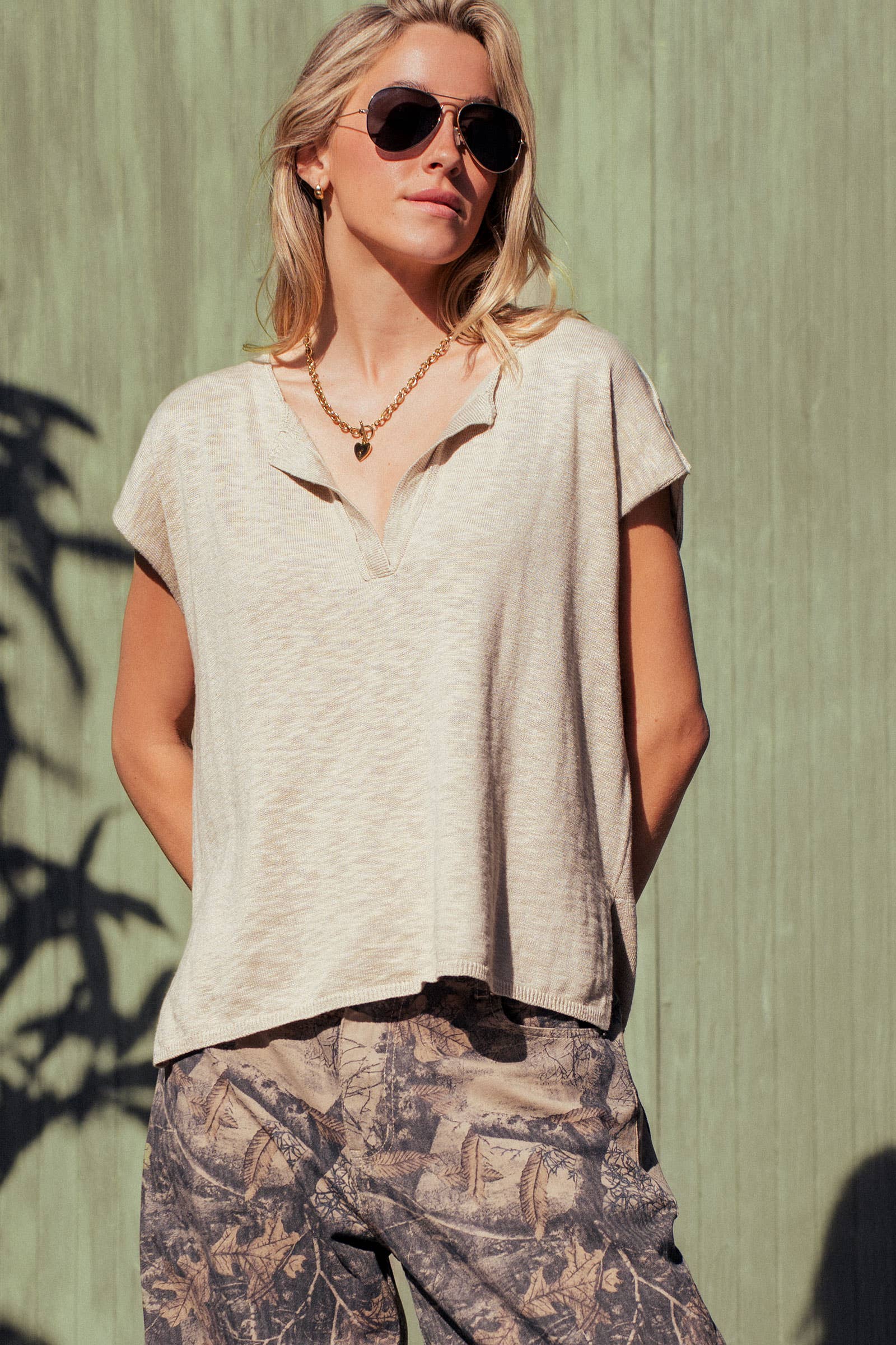 Design & Silhouette: Features a notched V-neckline (split neck) that frames the face beautifully. The silhouette is boxy and relaxed, with extended cap sleeves that offer breezy coverage.