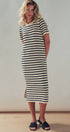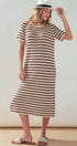 Elevate your casual wardrobe with this chic striped knit midi dress. Featuring a classic black and cream pattern in a breathable open-knit texture, this versatile piece offers a relaxed silhouette perfect for effortless daily wear.