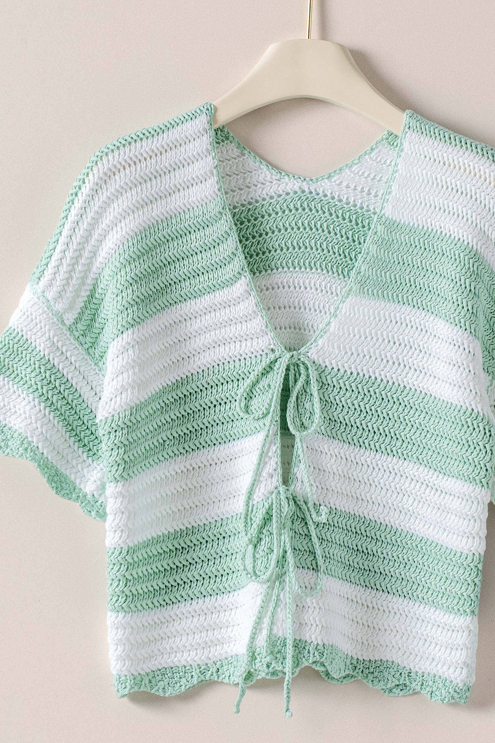 Capture the effortless bohemian trend with this striped crochet knit top. Featuring a breezy open-knit texture and a versatile tie-front closure, this lightweight cardigan is the perfect layering piece for beach days, festivals, or casual summer styling.