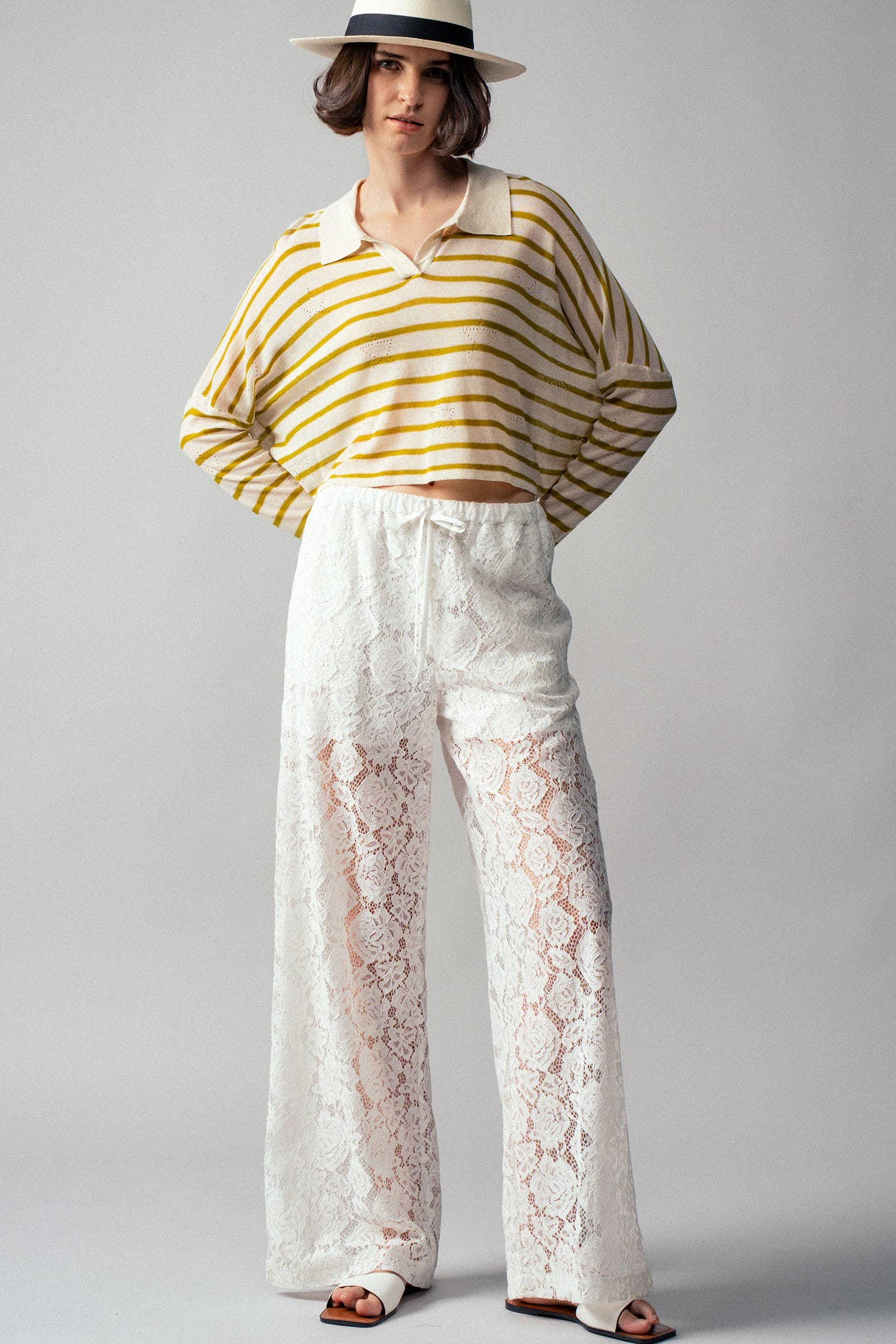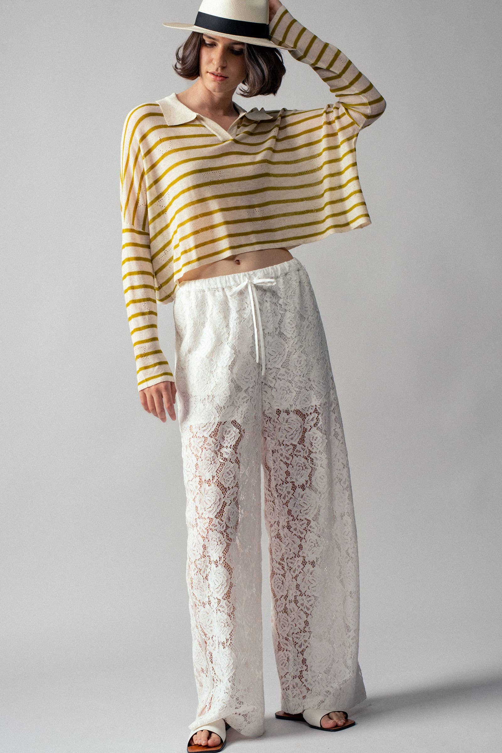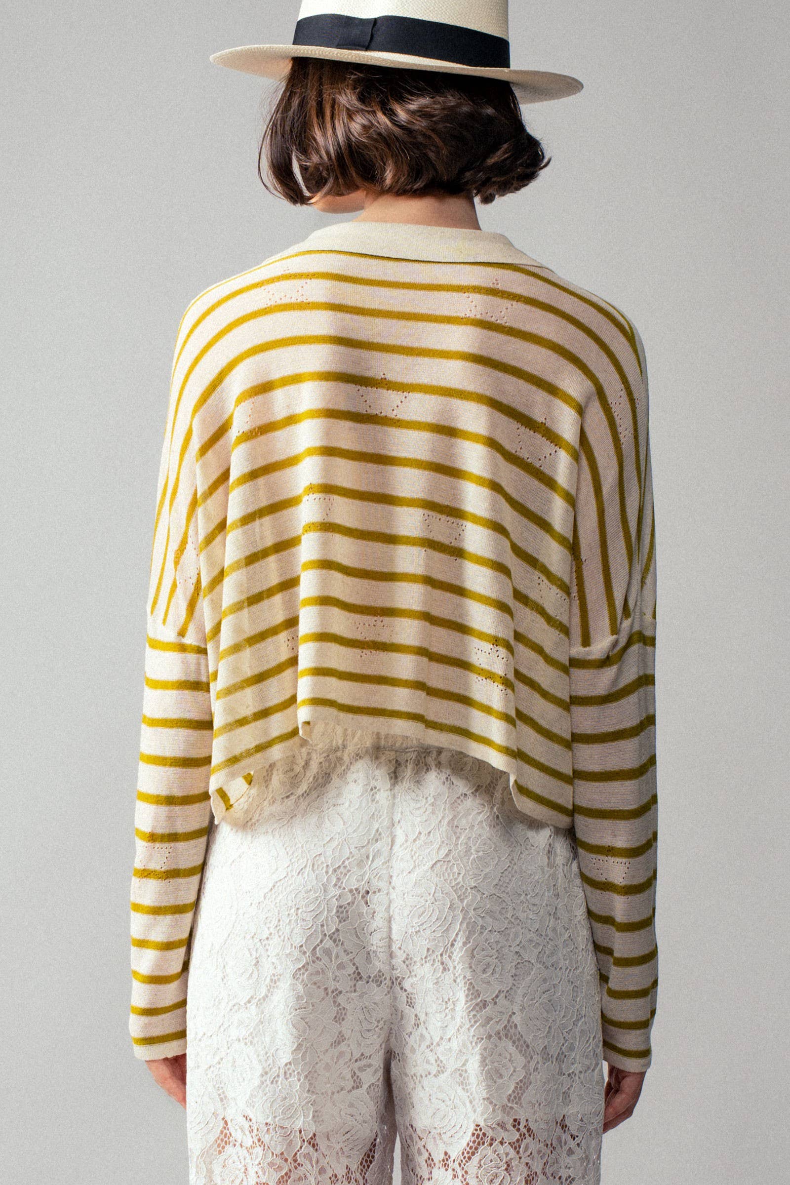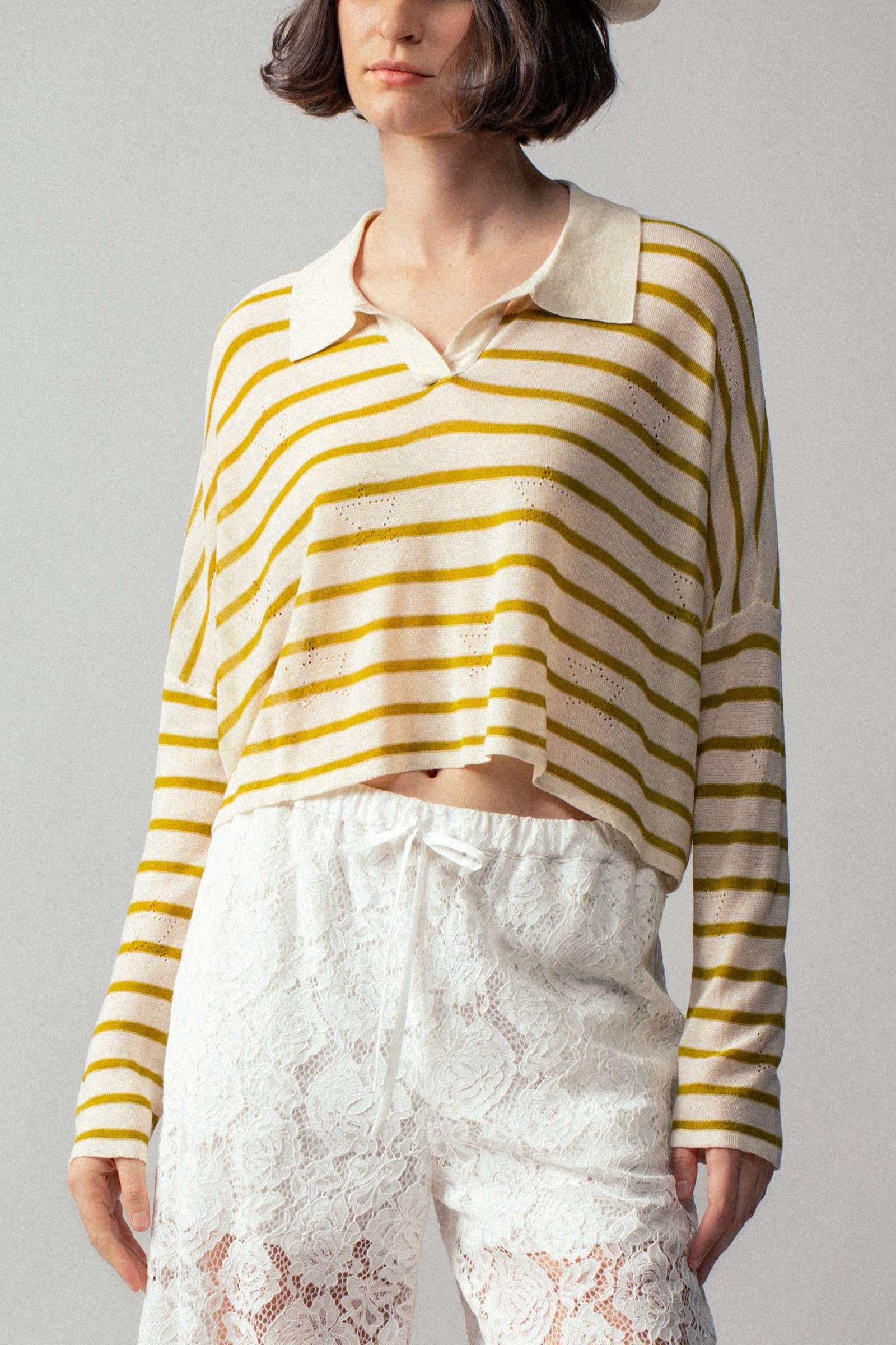 This striped polo top features a cropped silhouette with eyelet-embroidered star details and a collared neckline. Designed with long sleeves and a lightweight, breathable fabric, it’s perfect for layering or standalone wear during spring and summer.