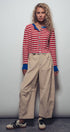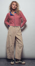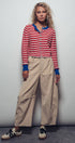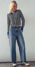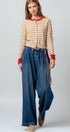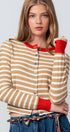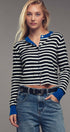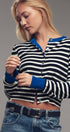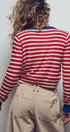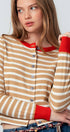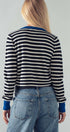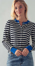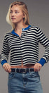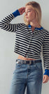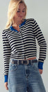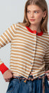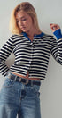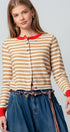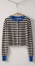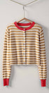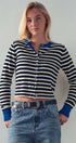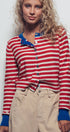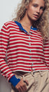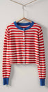 Make a bold statement with this playful cropped cardigan, featuring vivid red and white stripes with contrast blue trim. The soft knit and vibrant palette make it perfect for layering over dresses, denim, or game day outfits.