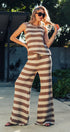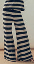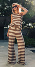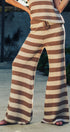 Channel a retro-inspired aesthetic with these comfortable knit pants. Featuring a bold horizontal stripe pattern in rich brown and neutral tones, the design includes a functional drawstring waistband and a flattering flare leg silhouette, making them perfect for relaxed, stylish lounging.