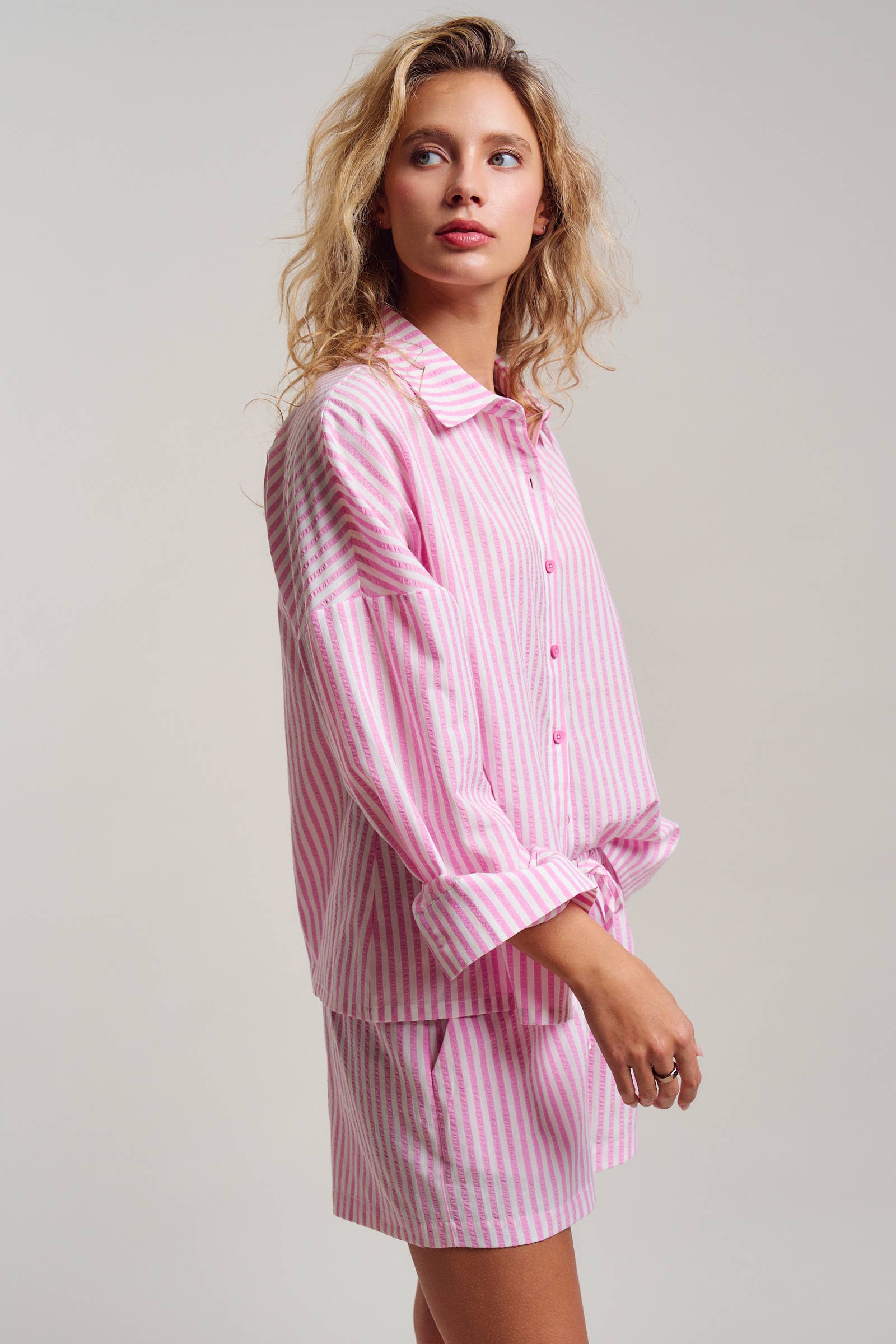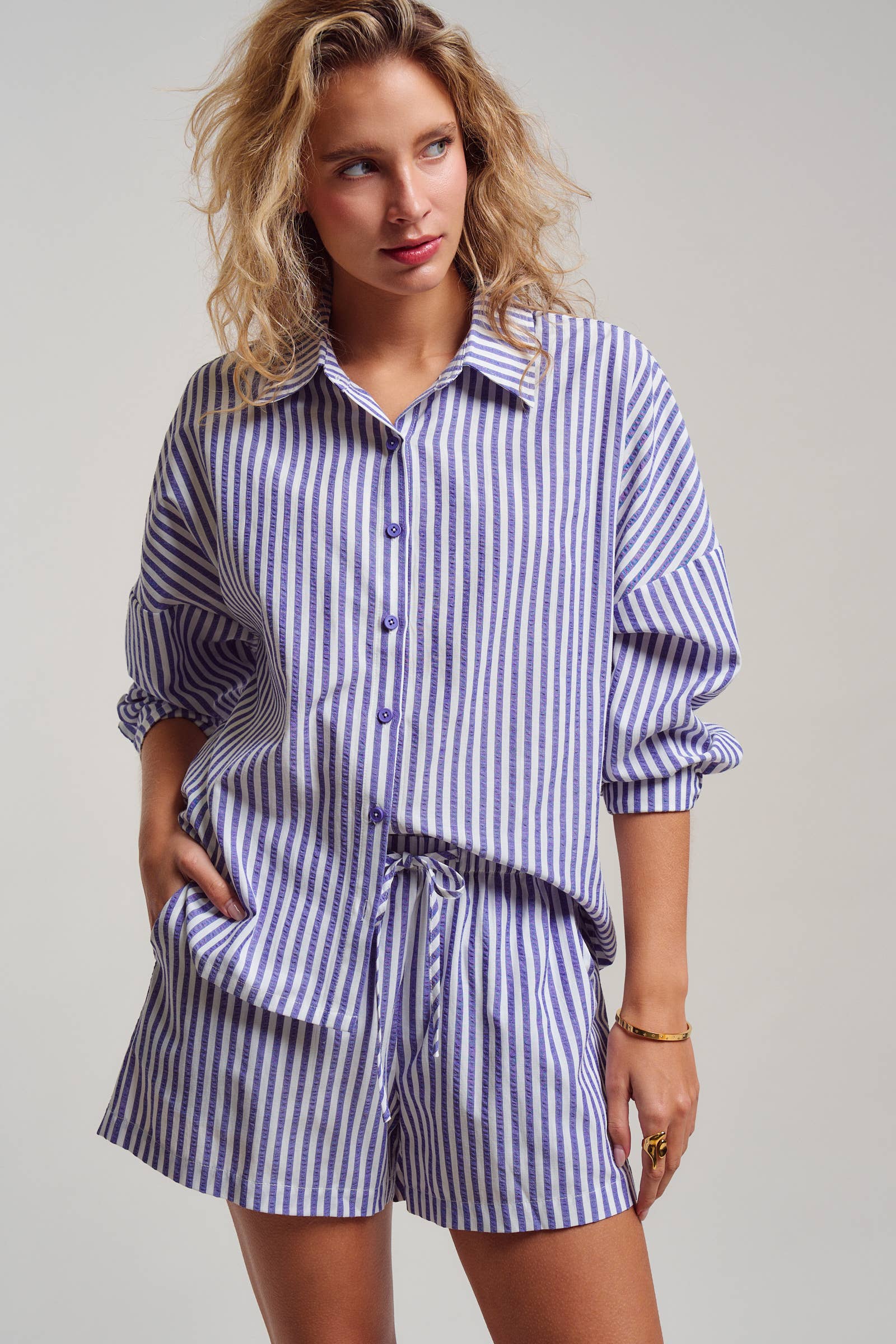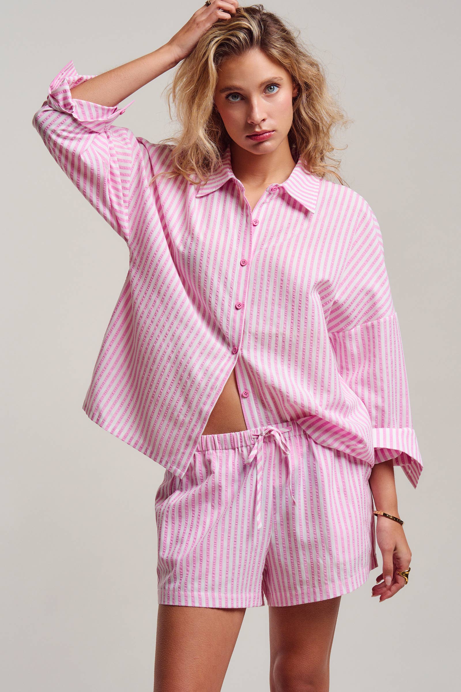 Master the art of effortless summer style with this classic seersucker set. borrowing from traditional menswear, this two-piece co-ord features an oversized button-down shirt and matching drawstring shorts. The lightweight, puckered texture makes it the ideal breathable option for humid days, whether worn as chic sleepwear, a beach cover-up, or a casual brunch outfit.