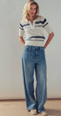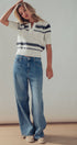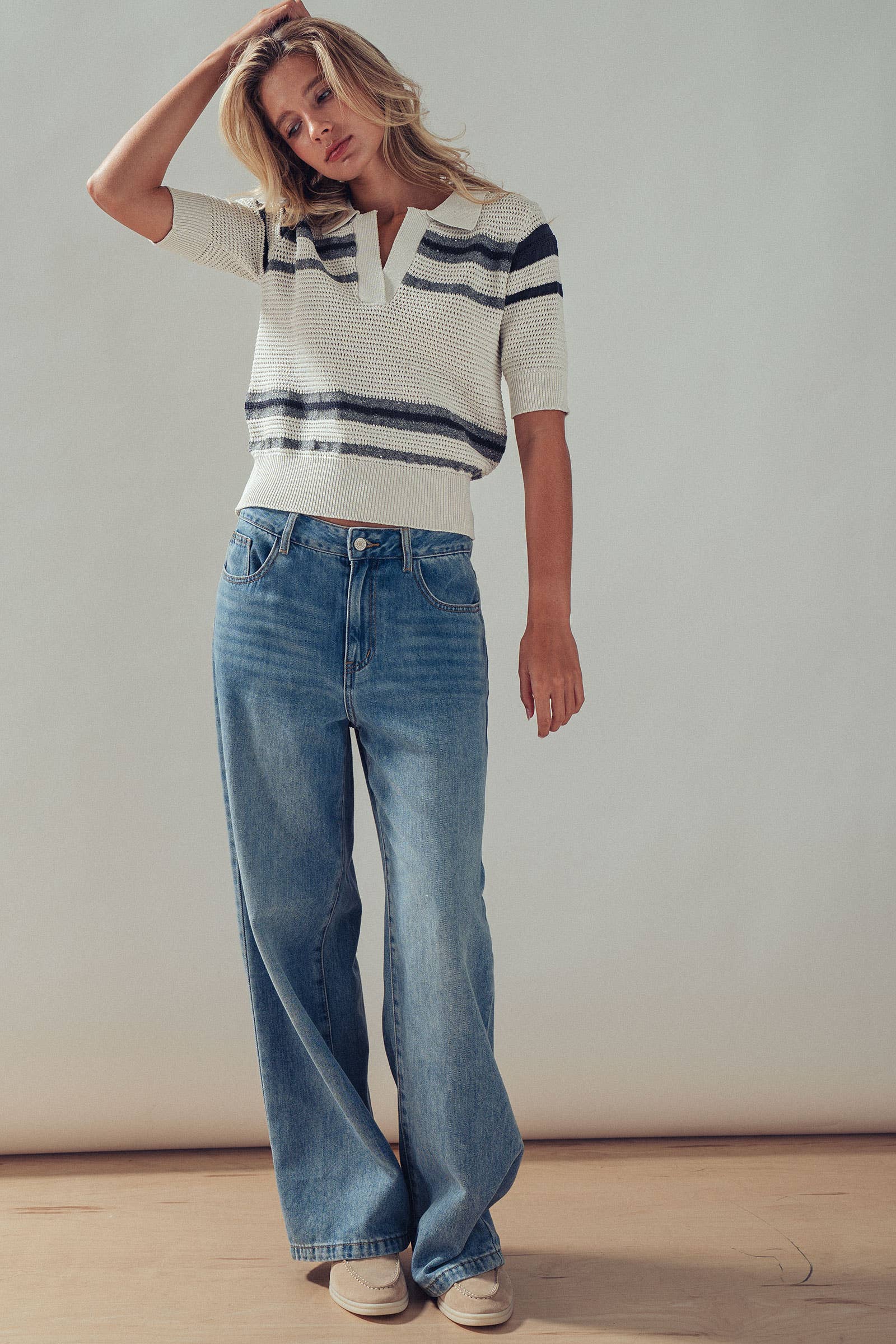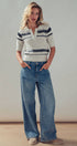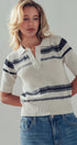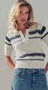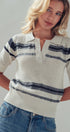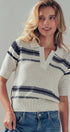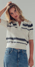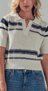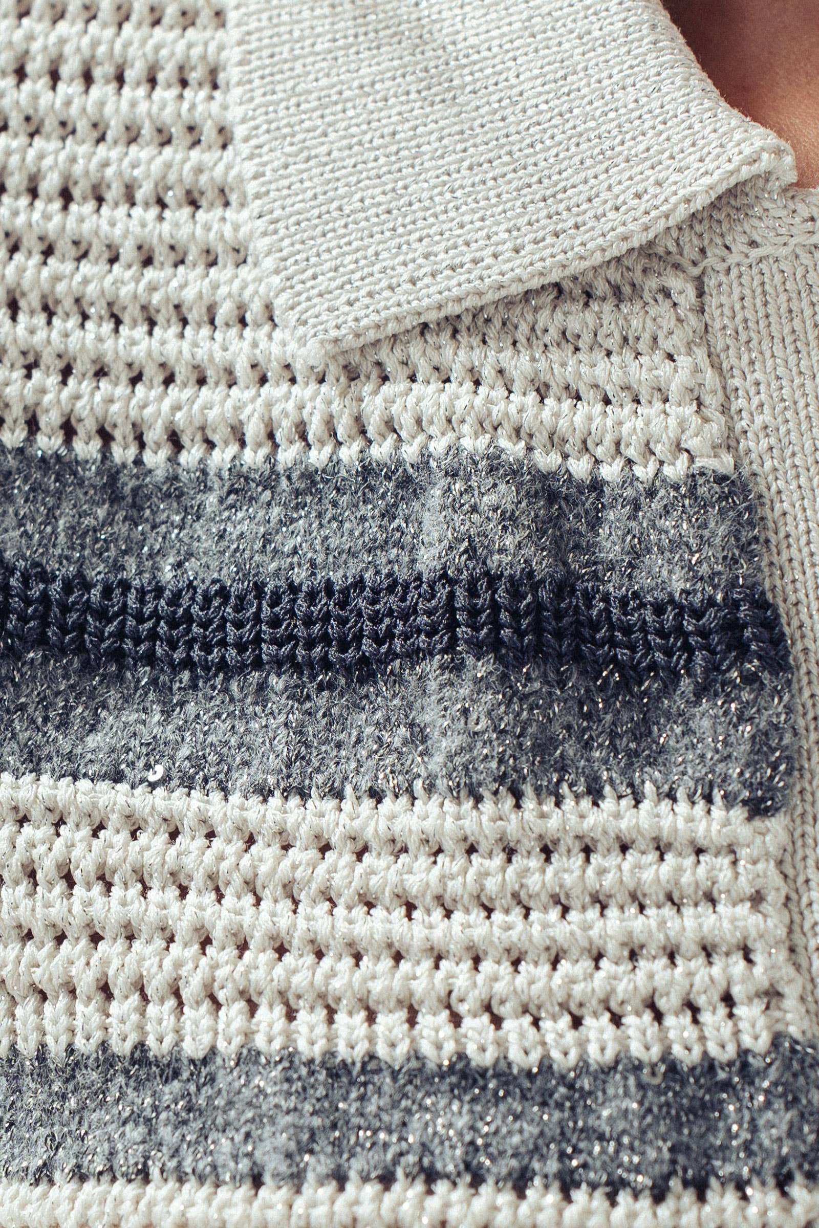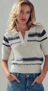 This short-sleeve knit top reimagines the classic polo with a feminine V-neck and a textured open-knit construction. Featuring varied stripes, it offers a refined yet casual look that pairs effortlessly with jeans or shorts. It is a versatile transition piece, lighter than traditional sweaters but offering more texture than a standard tee.