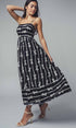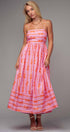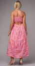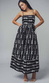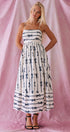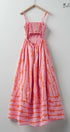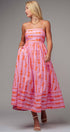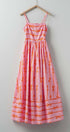 This playful maxi dress features a charming coral bow print on soft pink cotton, reminiscent of ribbons dancing across a summer sky. The smocked open back and full sweep skirt add romantic flair to this delightful piece.