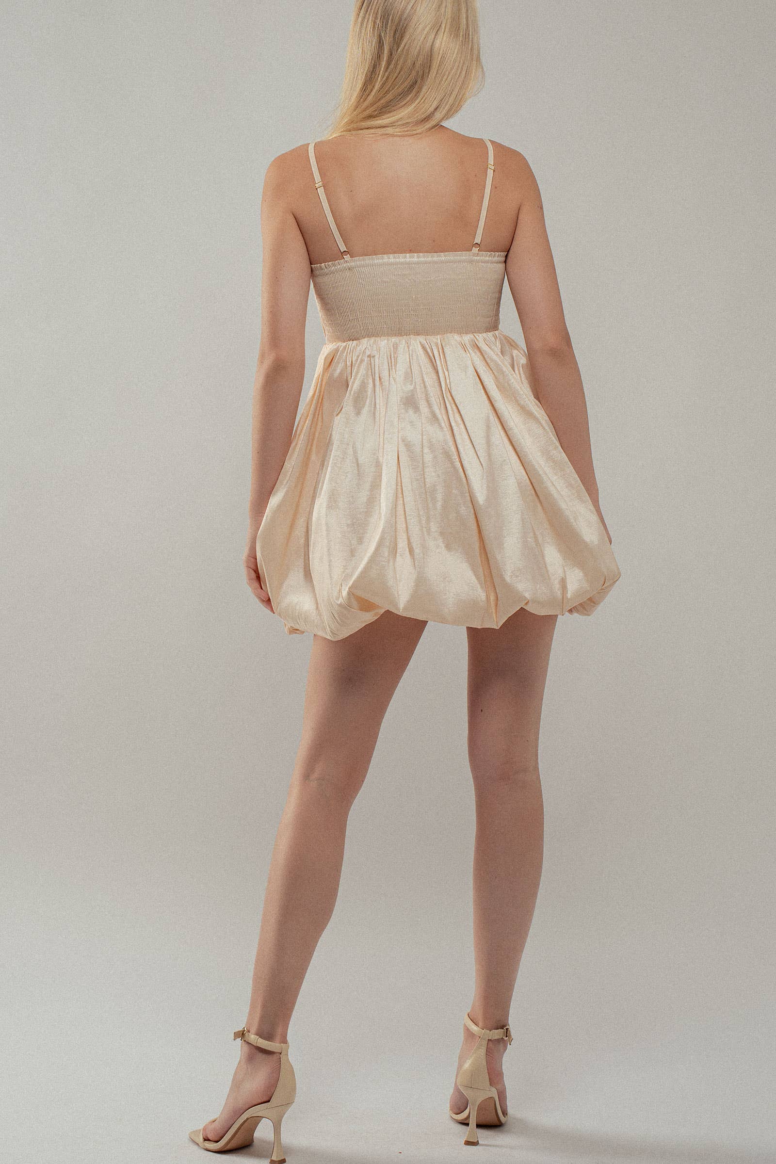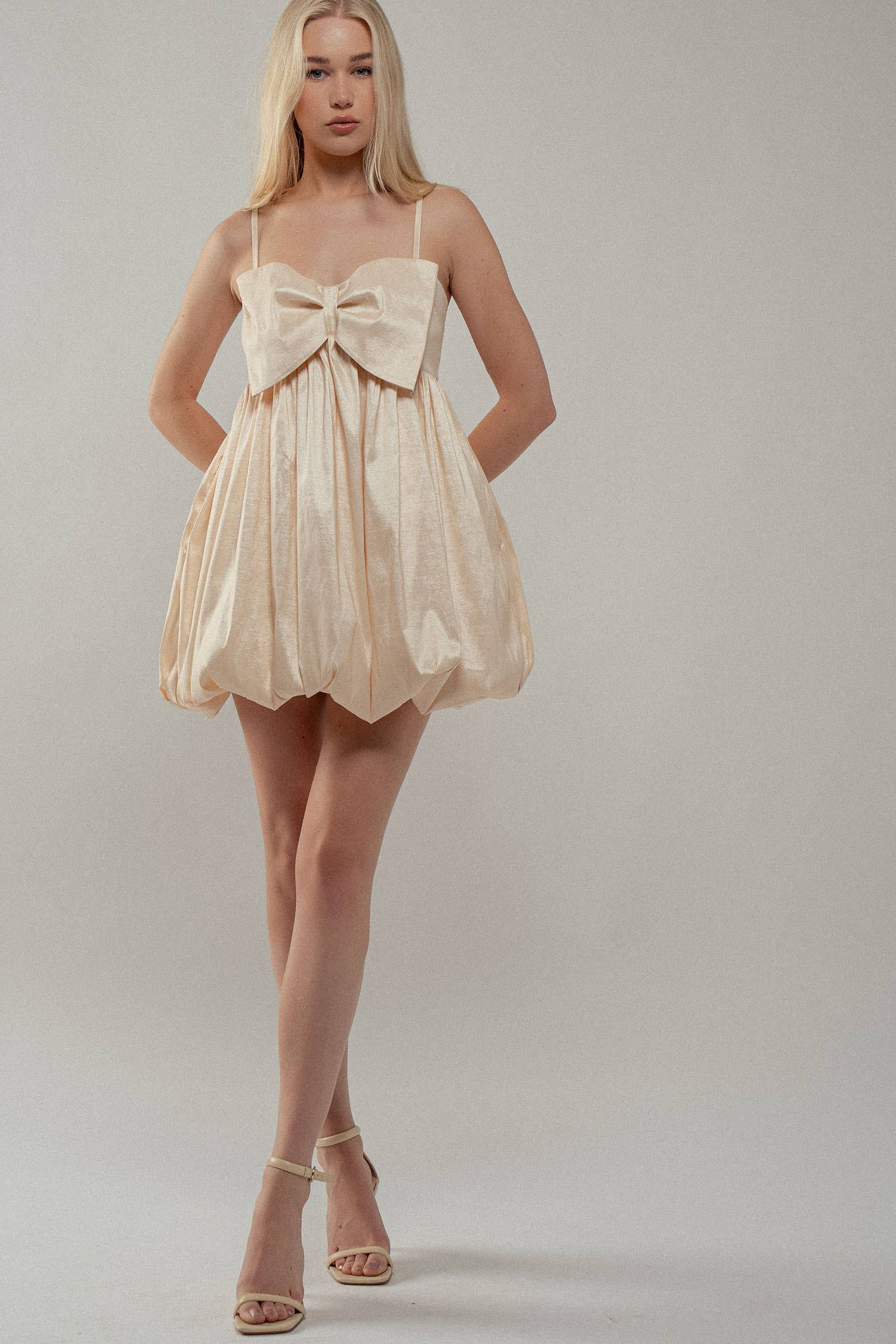 This playful mini dress features a dramatic front bow, sweetheart neckline, and adjustable spaghetti straps for a feminine silhouette. The smocked back ensures a comfortable fit, while the voluminous balloon hem adds a whimsical touch perfect for parties, bridal showers, or summer events. Crafted from a lustrous, lightweight fabric for a statement look.