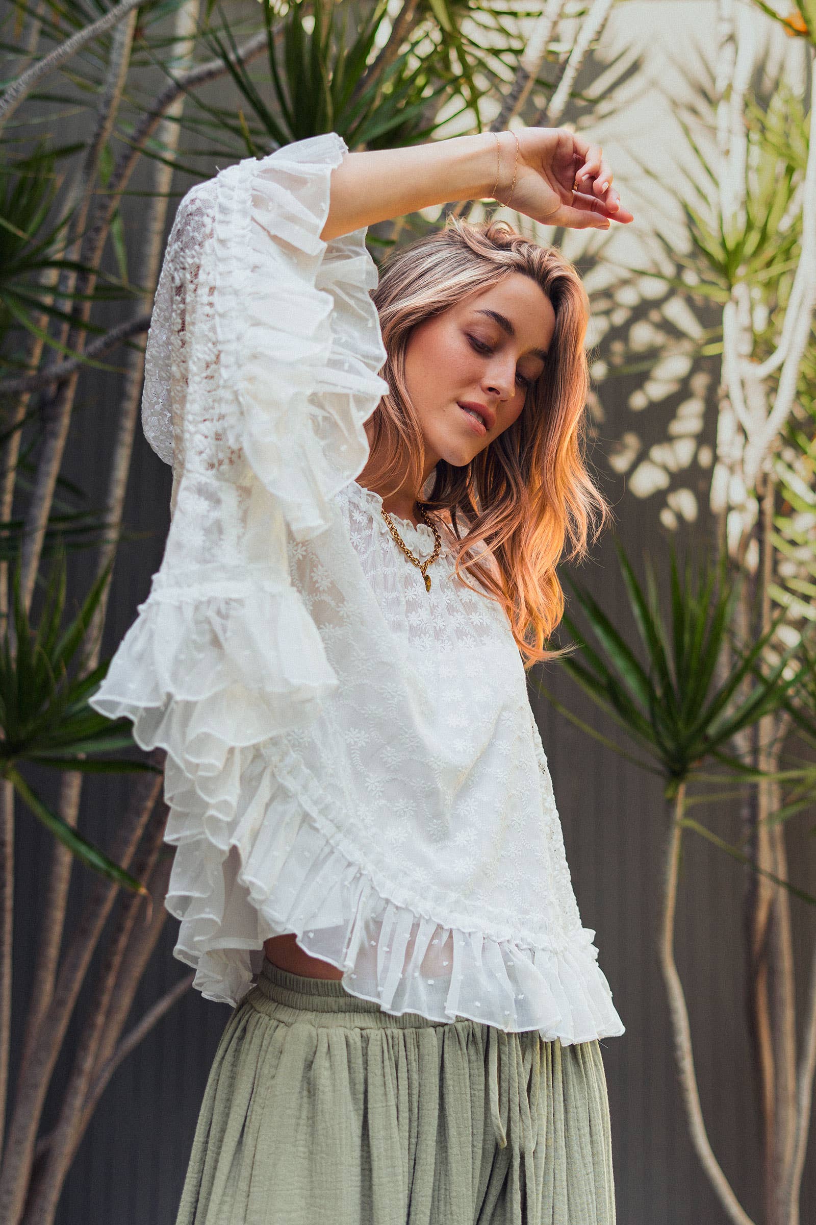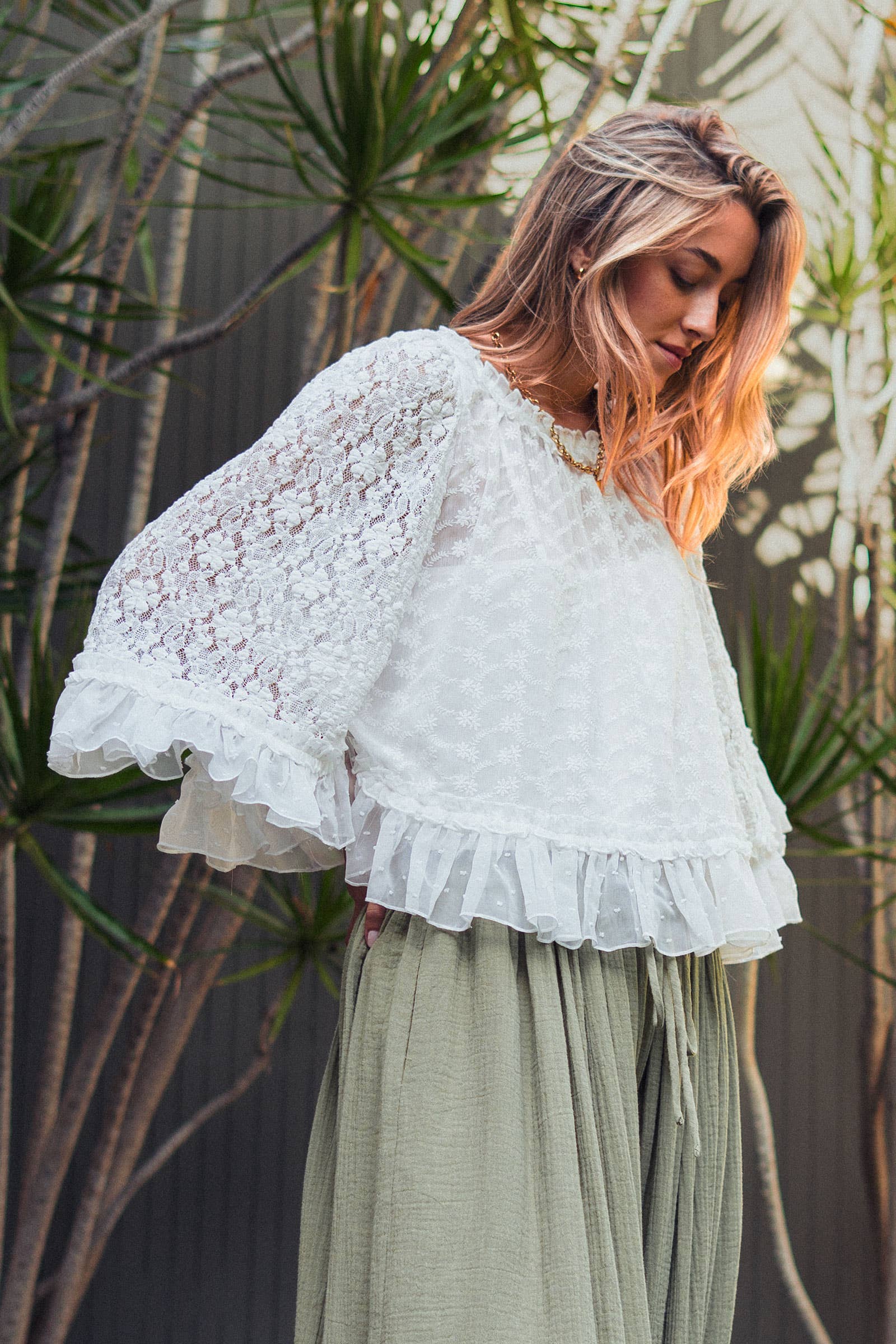 Design & Details: detailed with a sheer Swiss dot overlay and intricate floral lace on the sleeves. The design features a voluminous flutter sleeve, a playful ruffled hem, and a button-keyhole closure at the back neck.