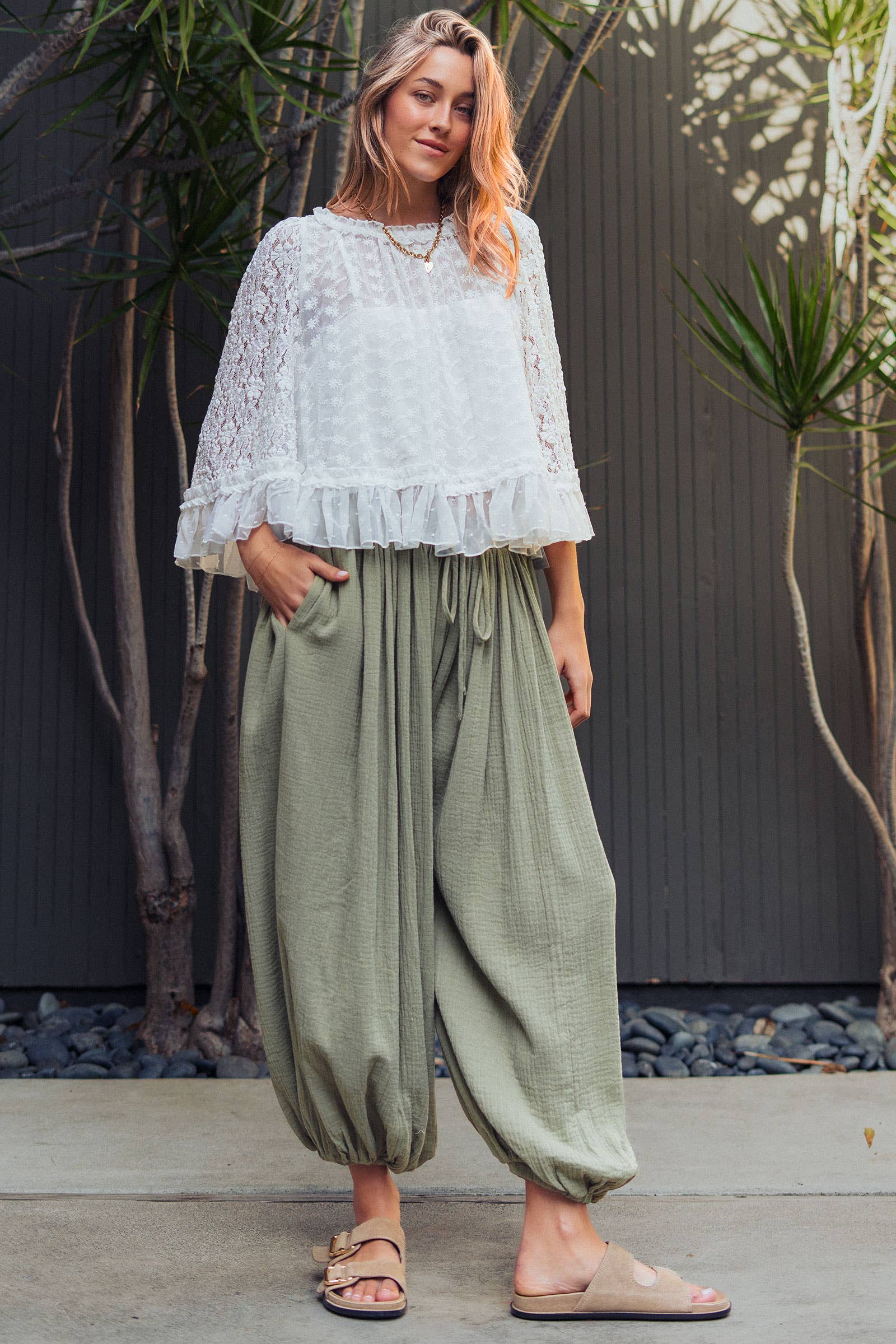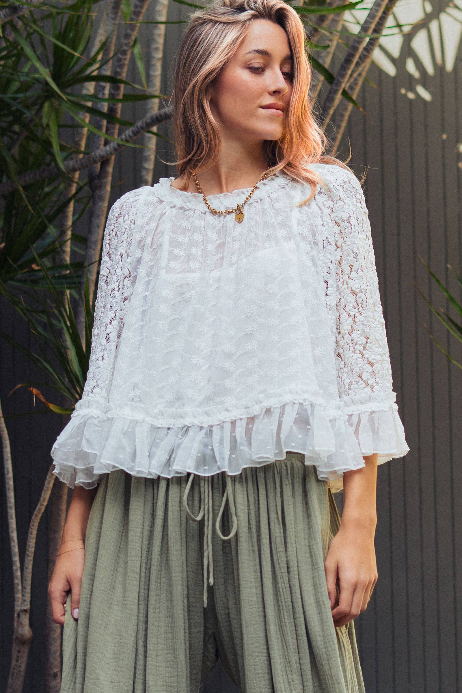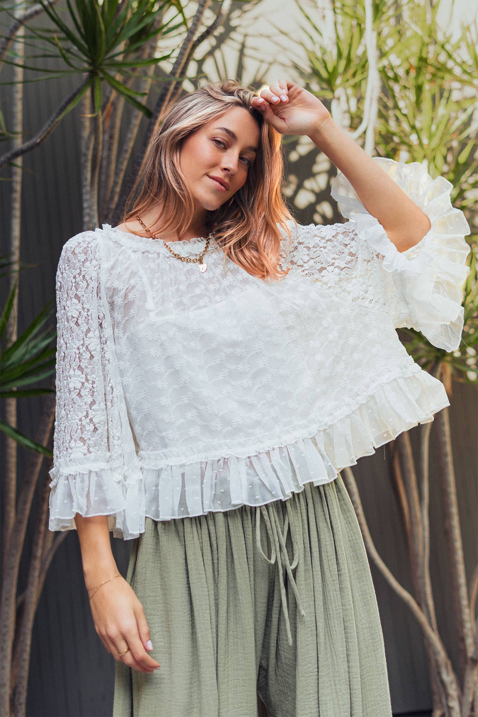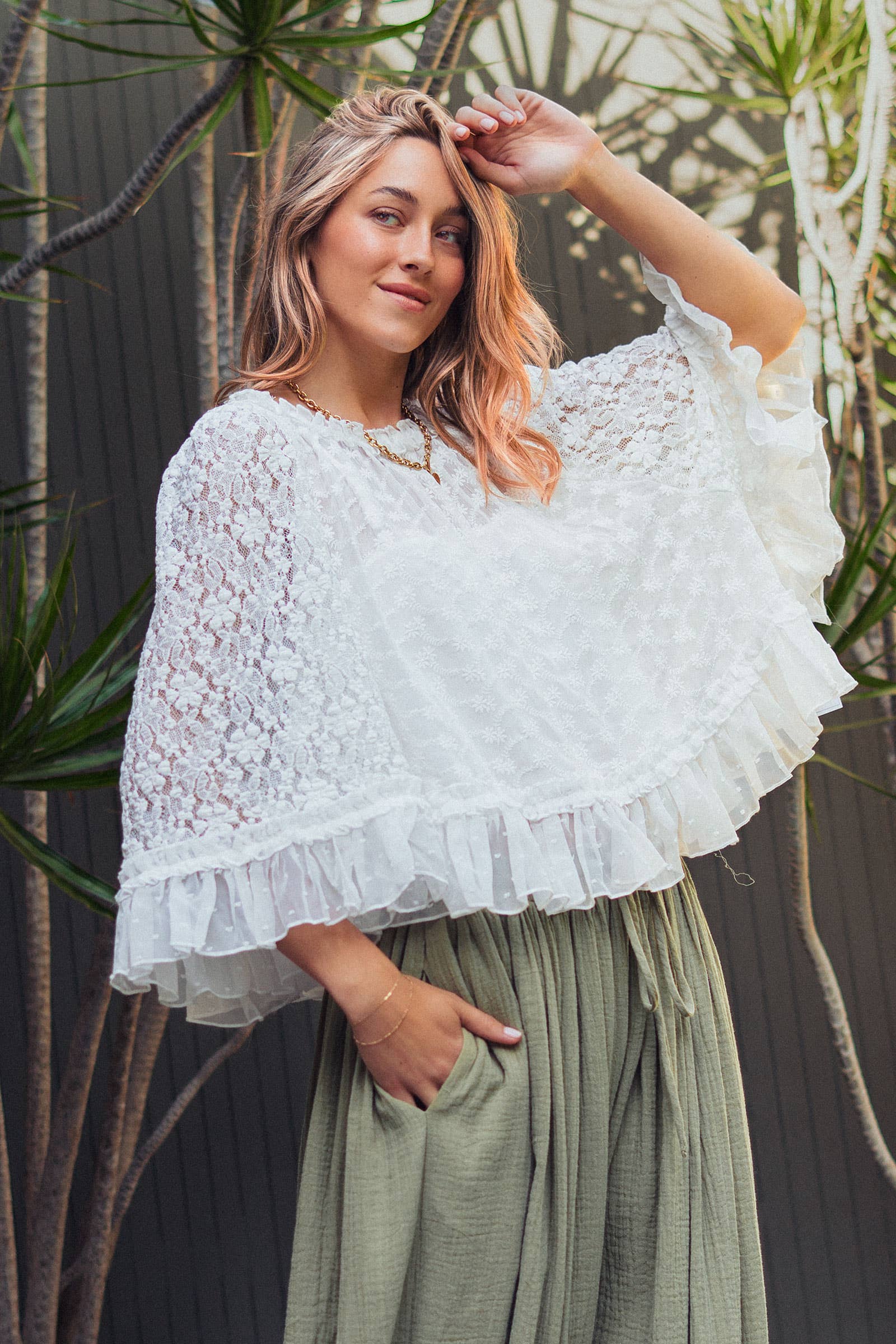 Bring a breath of fresh air to your boutique with this ethereal white top, featuring a romantic mix of floral lace and Swiss dot textures. The relaxed, flowy silhouette and flutter sleeves make it a perfect choice for boho-chic styling or elevated everyday wear.