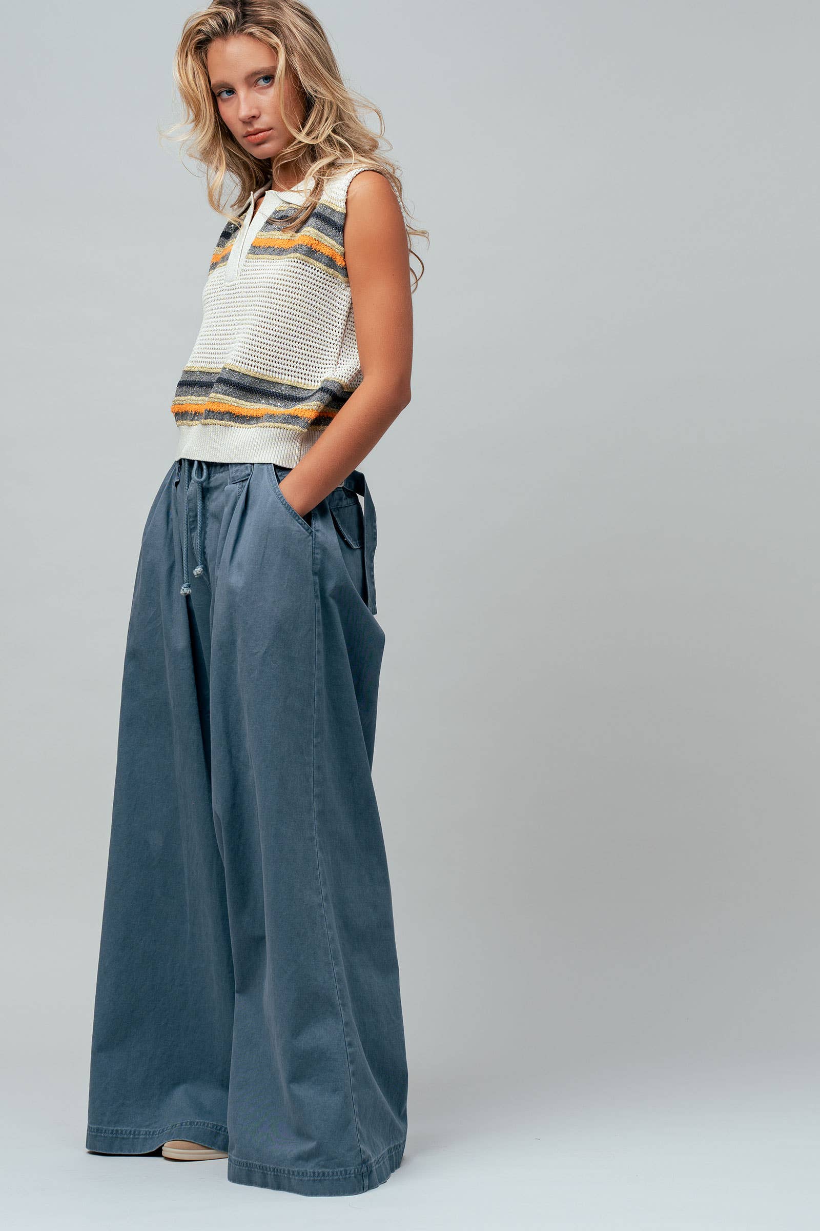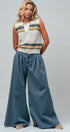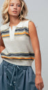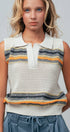 Design: Sleeveless polo silhouette featuring mixed-texture horizontal stripes (metallic and fuzzy chenille).