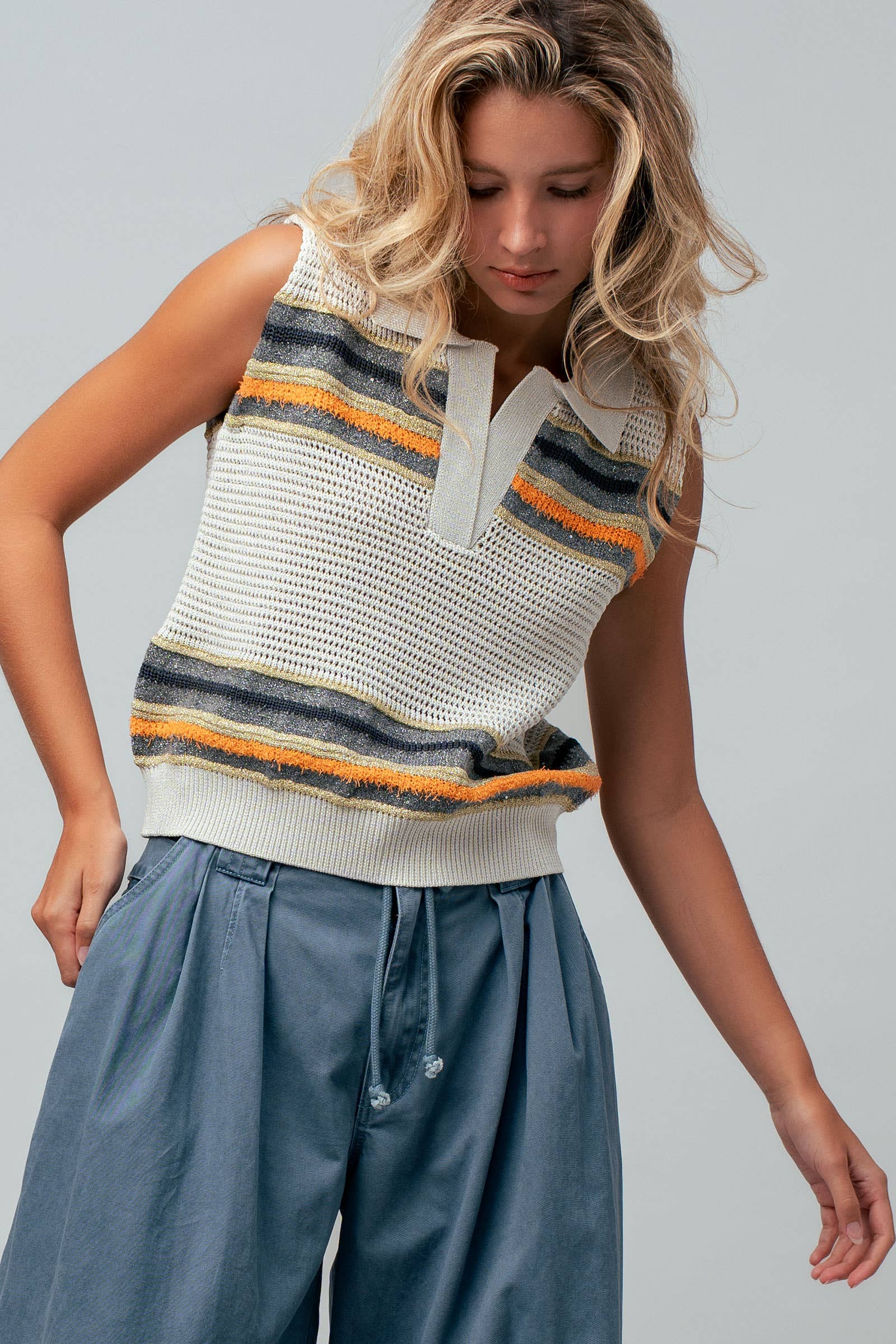 Add a touch of retro flair to your wardrobe with this textured knit vest. Featuring a mix of metallic shimmer and fuzzy stripes on an airy open-knit base, this collared top is an effortless statement piece perfect for solo wear or layering.