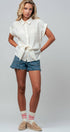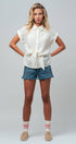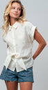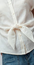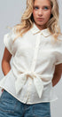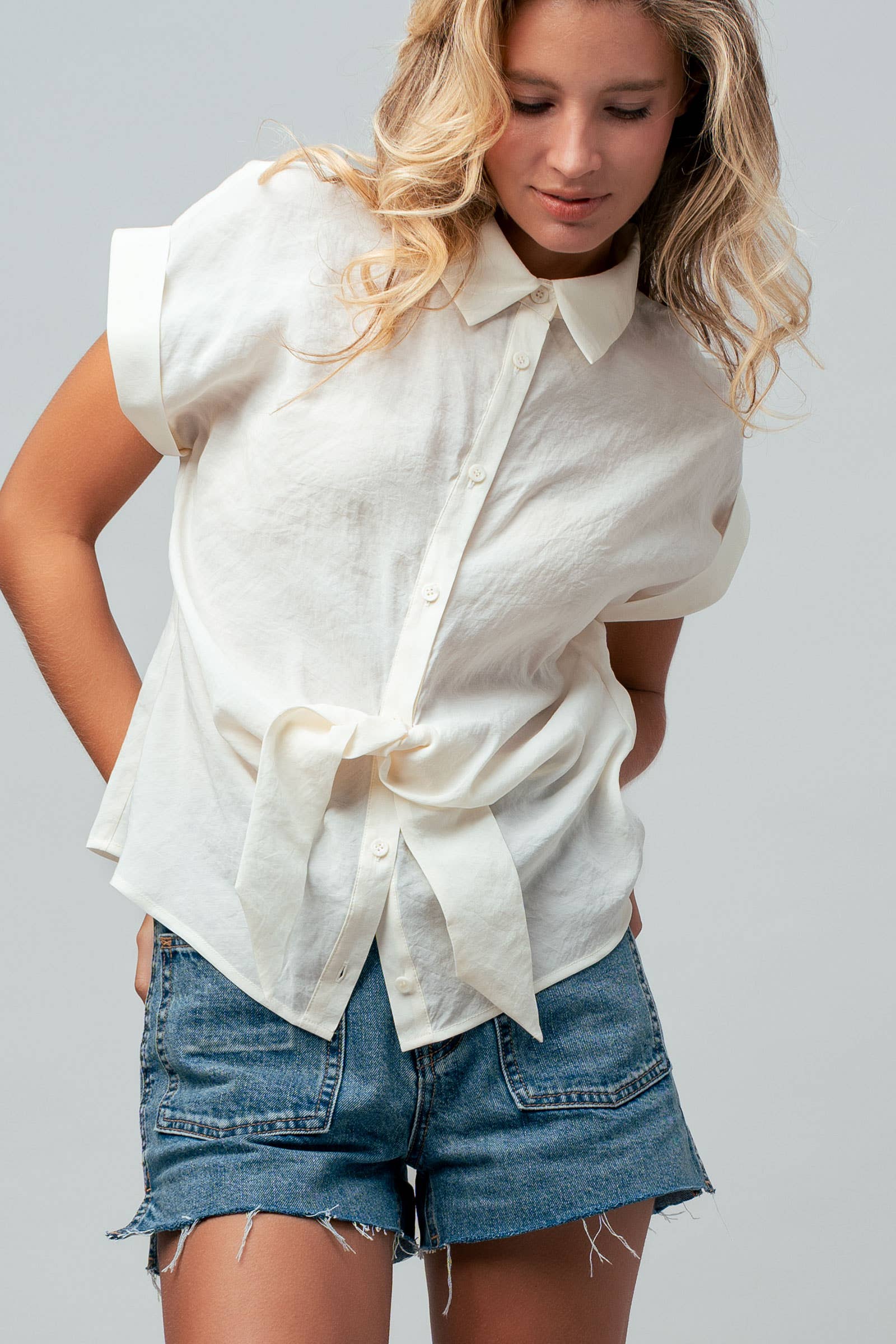 Design: Solid cream button-down shirt with a self-tie front hem.
