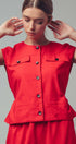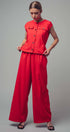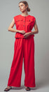 Design: A sleeveless, wide-leg jumpsuit with a button-front bodice and an integrated tie-back belt that creates a peplum overlay.