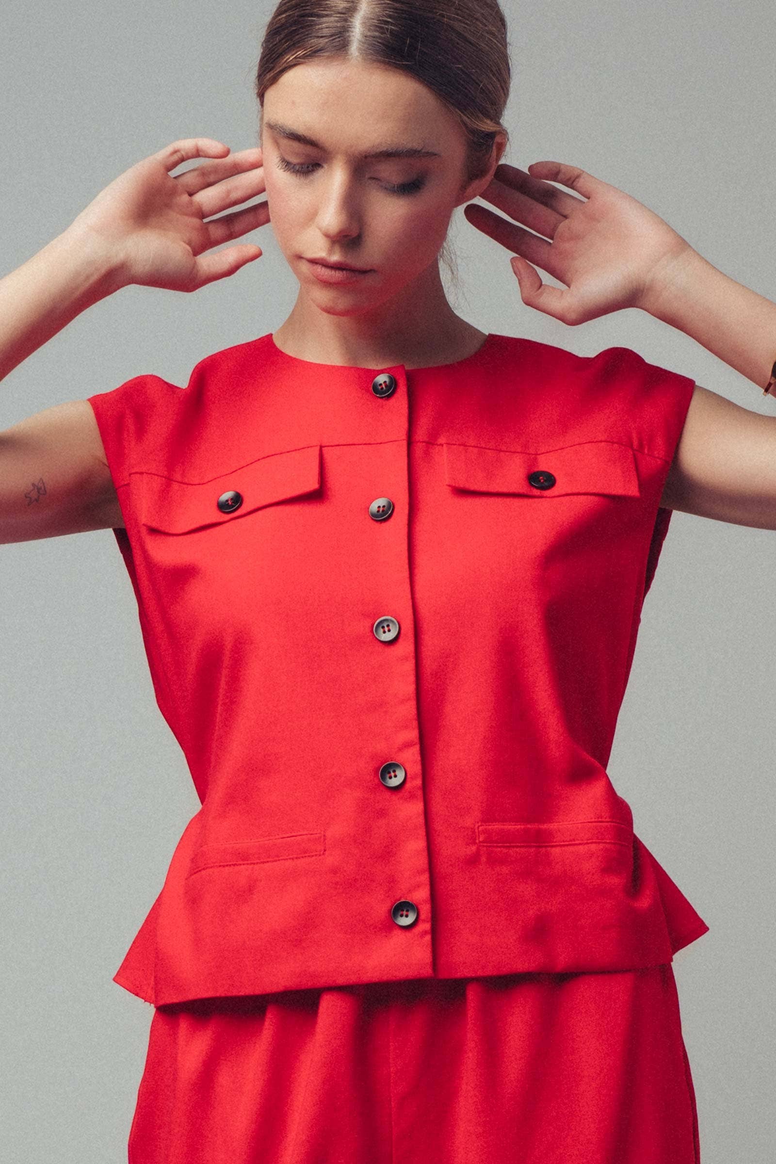 Details: Features a round neckline and two decorative flap pockets on the chest for a touch of utility-inspired structure.