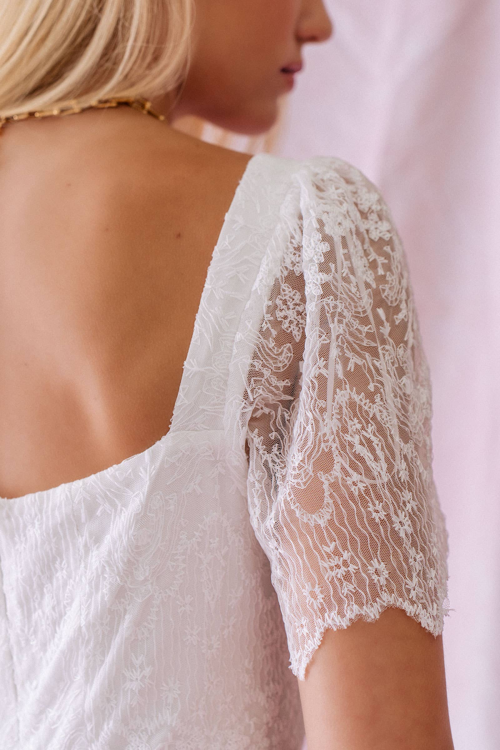 A romantic mini dress featuring delicate all-over lace, sweetheart neckline with tie detail, ethereal puff sleeves and tiered skirt that combines vintage-inspired elegance with modern details, making it perfect for bridal events and garden parties with its feminine appeal.