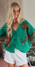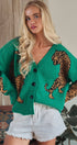 Make a bold statement with this cozy knit cardigan, featuring a striking tiger jacquard pattern. Designed with a classic V-neck, button-front, and a relaxed silhouette, this sweater is a unique and playful layering piece that adds a fierce touch to any outfit.
