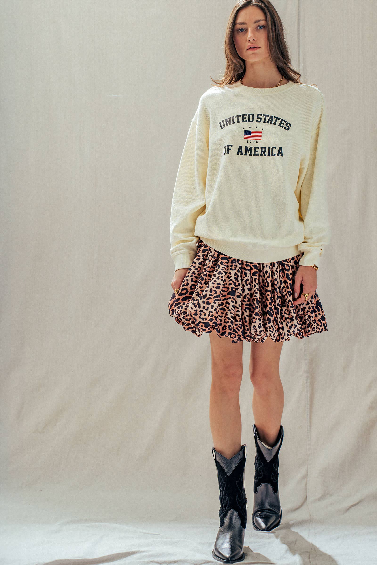 Add a layer of cozy patriotism to your shop with this vintage-inspired pullover. Crafted from 100% cotton with a premium waffle knit texture, this cream top features classic "United States of America" varsity lettering and a 1776 flag graphic—perfect for cooler summer evenings or effortless year-round style.