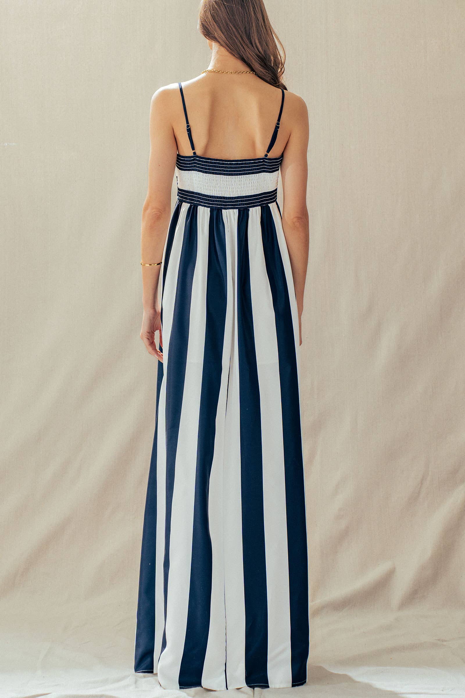 Design & Fit: Defined by wide, graphic vertical stripes in Navy and White that visually lengthen the silhouette. The bodice features a clean square neckline and adjustable spaghetti straps for a custom fit.