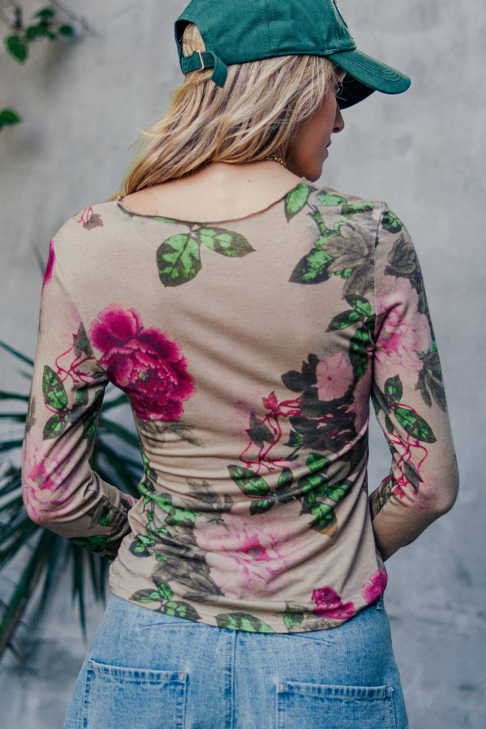 Design & Print: Features a romantic, large-scale floral print with deep pink roses and rich green foliage set against a neutral taupe background. The silhouette is fitted and streamlined, perfect for layering or wearing solo.