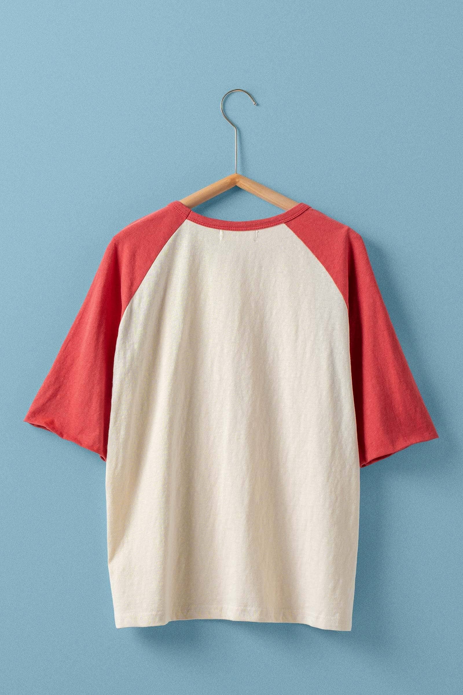 Design: A timeless baseball-style tee featuring a cream body with contrasting colored raglan sleeves and a crew neckline.