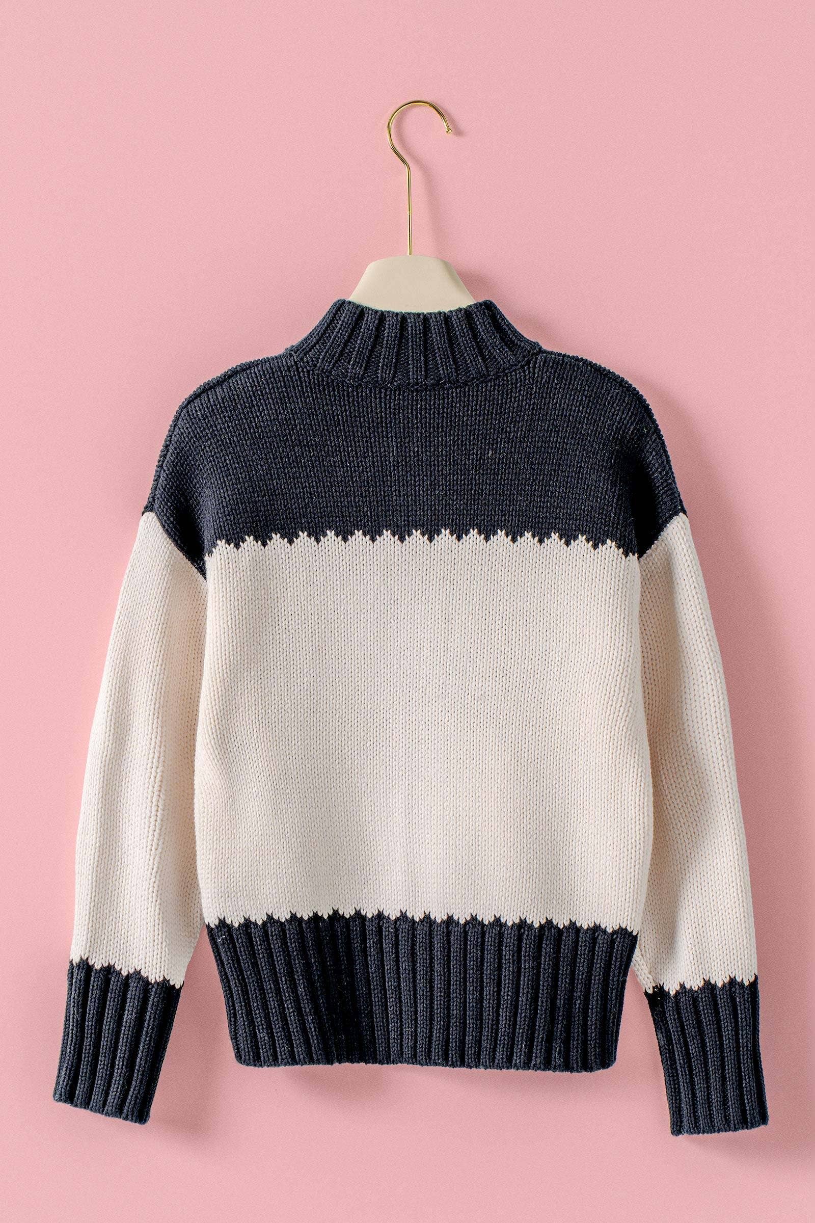 Design: A button-down cardigan with a cozy mock neck and raglan-style long sleeves. It features a striking zigzag "chevron" color block design separating the navy blue top from the cream bottom.