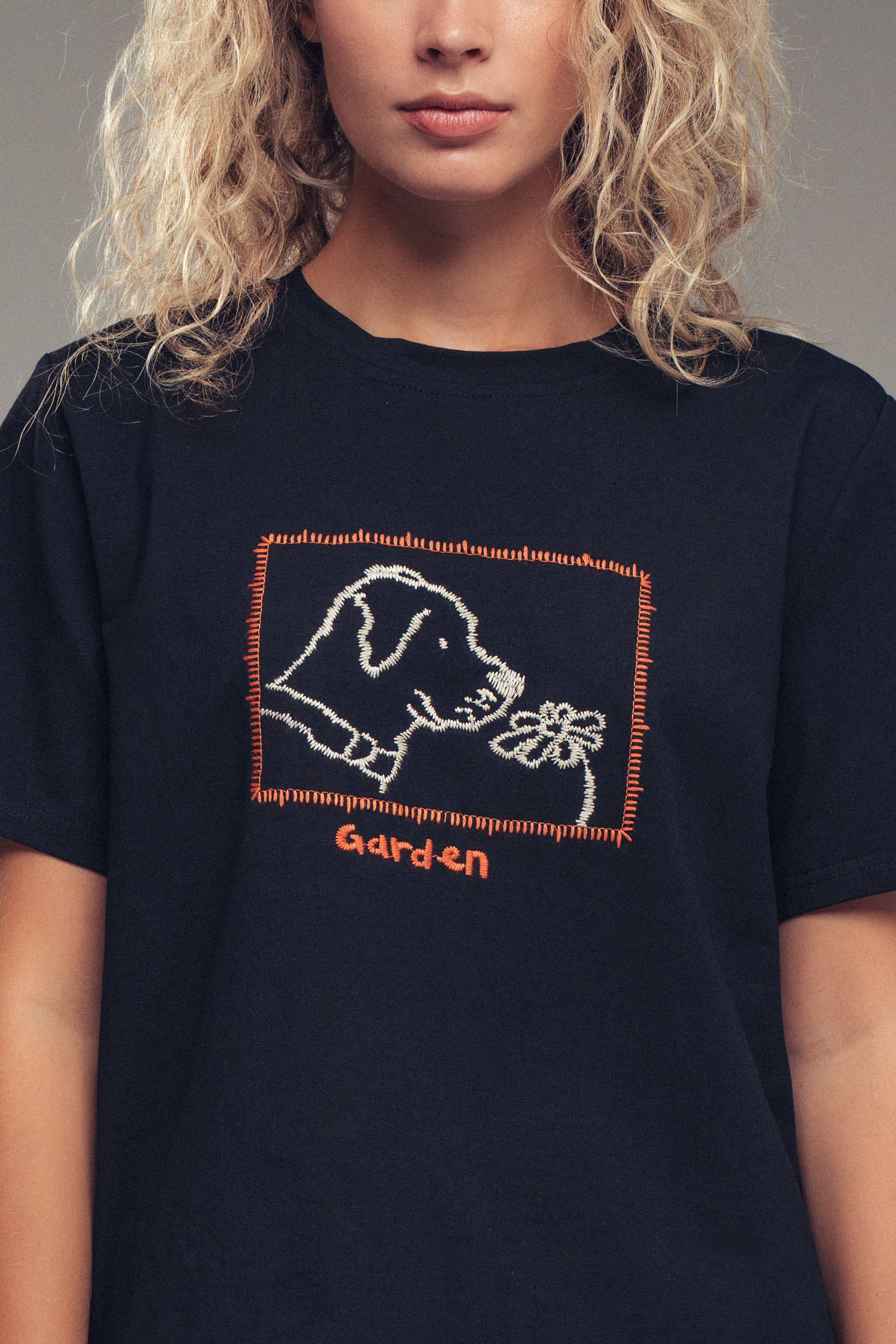 Bring charm to your everyday look with this soft cotton tee, featuring a sweet embroidered dog-and-daisy motif that adds a touch of whimsy to your wardrobe. Crafted from breathable fabric for all-day comfort, the design offers a relaxed, straight fit with a clean crew neckline, making it an ideal choice for garden days or casual summer outings.