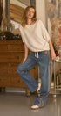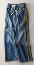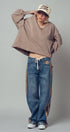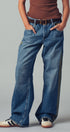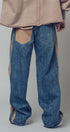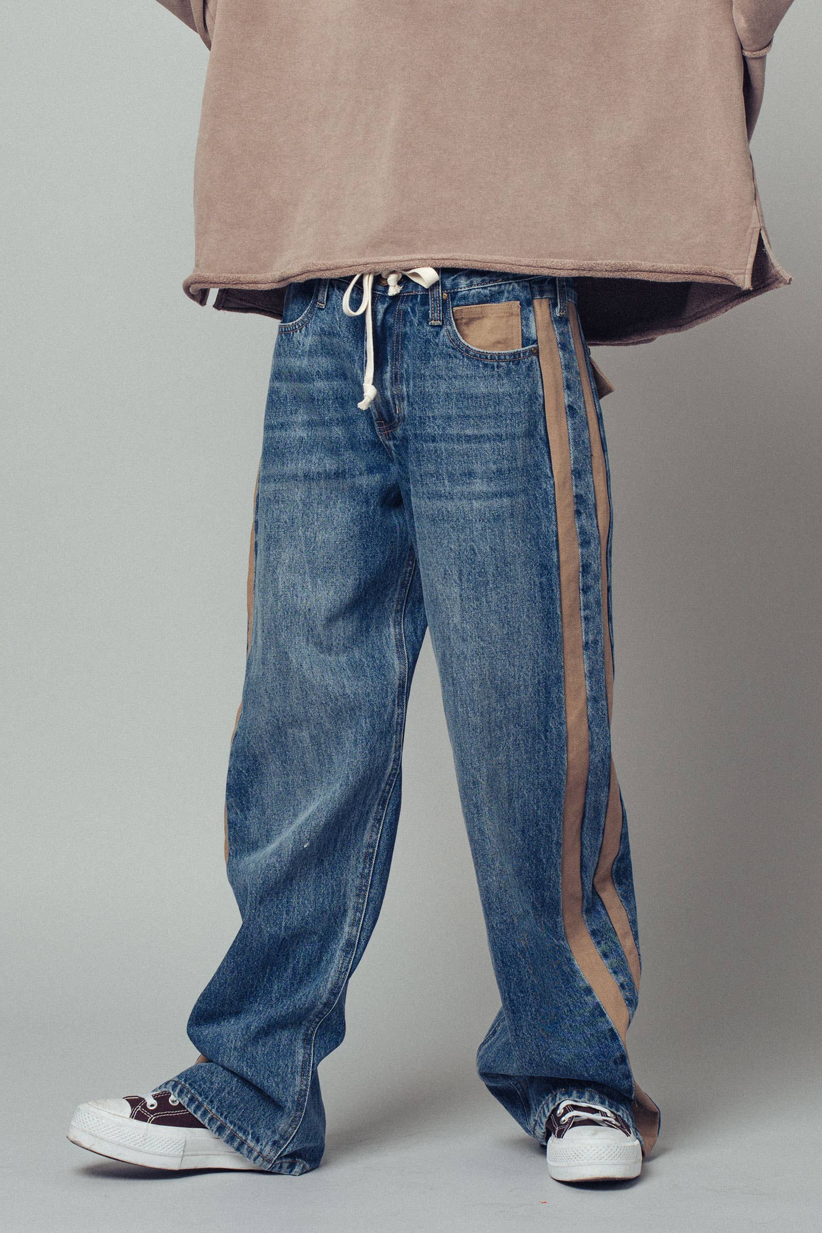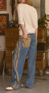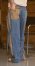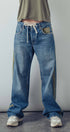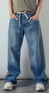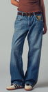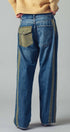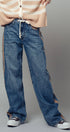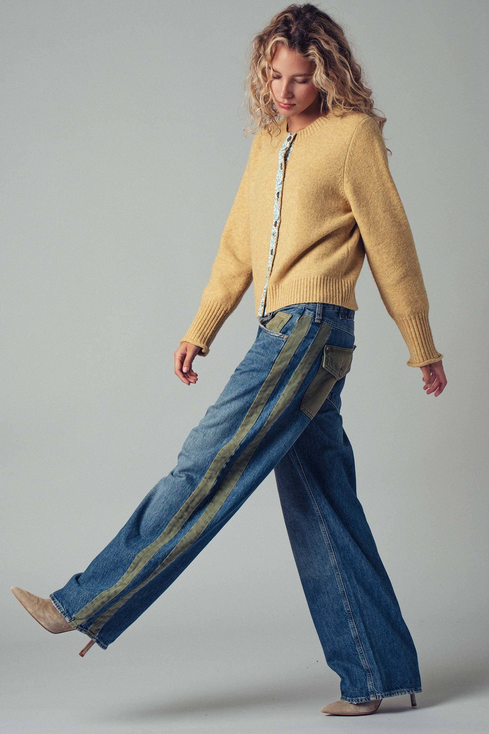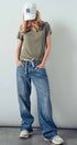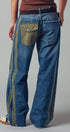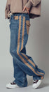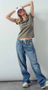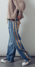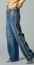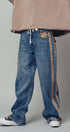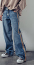 A relaxed denim staple with a utilitarian edge. These wide-leg jeans feature contrasting olive green side stripes, a mixed patch pocket at the back, and an angled coin pocket for standout detail. With a mid-rise waist and full-length silhouette, they balance everyday comfort with modern statement style.