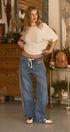 Fit: Relaxed wide-leg with mid-rise waist, full length